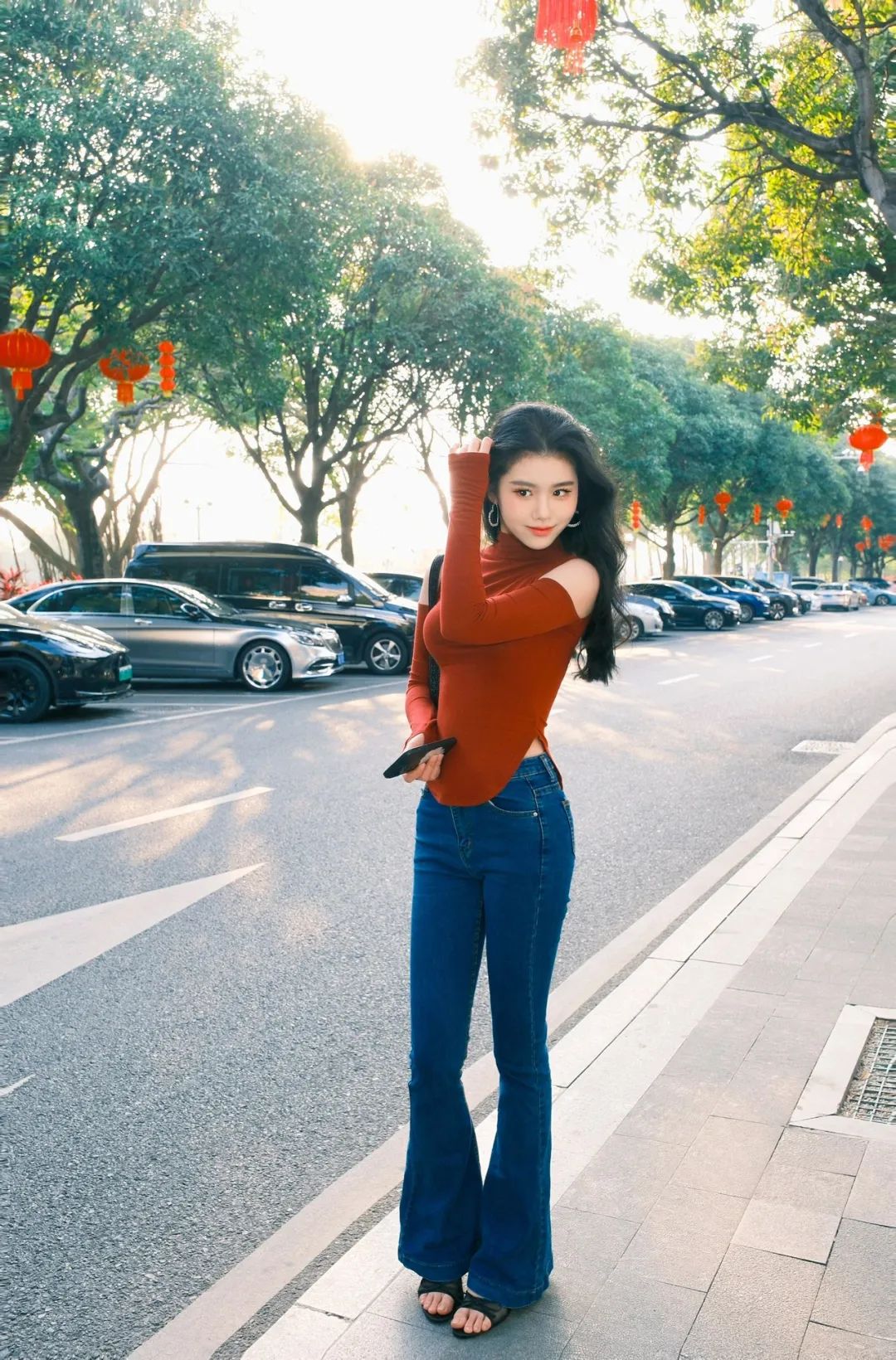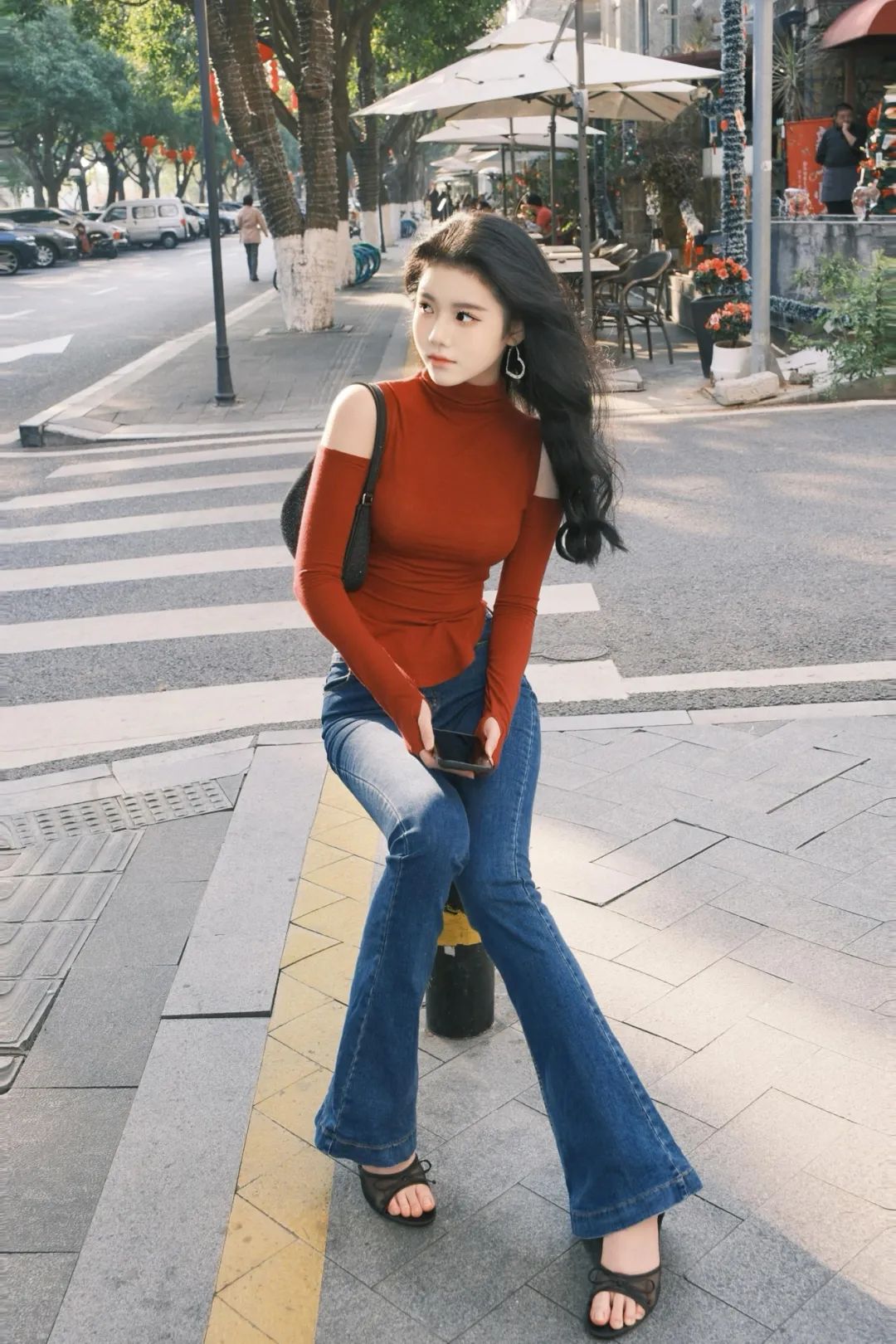 侧身坐于路桩上,手持手机自然垂于身前,另一手搭在腿上,避免了手部的僵硬感。这样的拍照姿势形成自然的动态感,同时也凸显出腿部线条和喇叭牛仔裤的造型。为整体造型增添了几分随性与优雅。