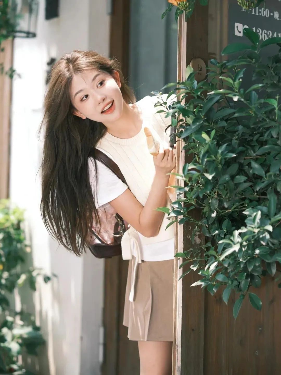 侧身躲在门后,一手扶门,一手拿着食物,歪头露齿笑,眼神看向远方,这样的姿态俏皮可爱,拍出来的照片显青春甜美活力。
