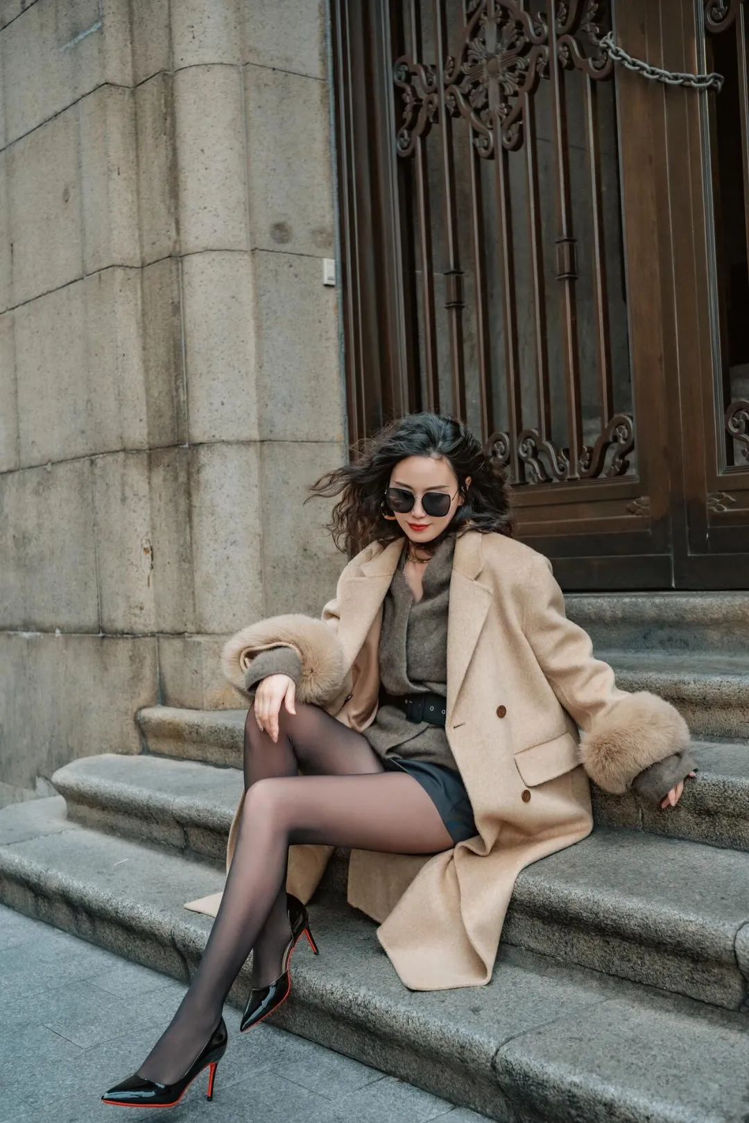 坐在台阶上,双腿交叉倾斜摆放,身体微微侧向镜头,一只手自然搭在腿上,另一只手置于身旁,眼神看向镜头方向。这种姿势能够凸显大衣的质感,拍出来的照片舒展且富有曲线美。