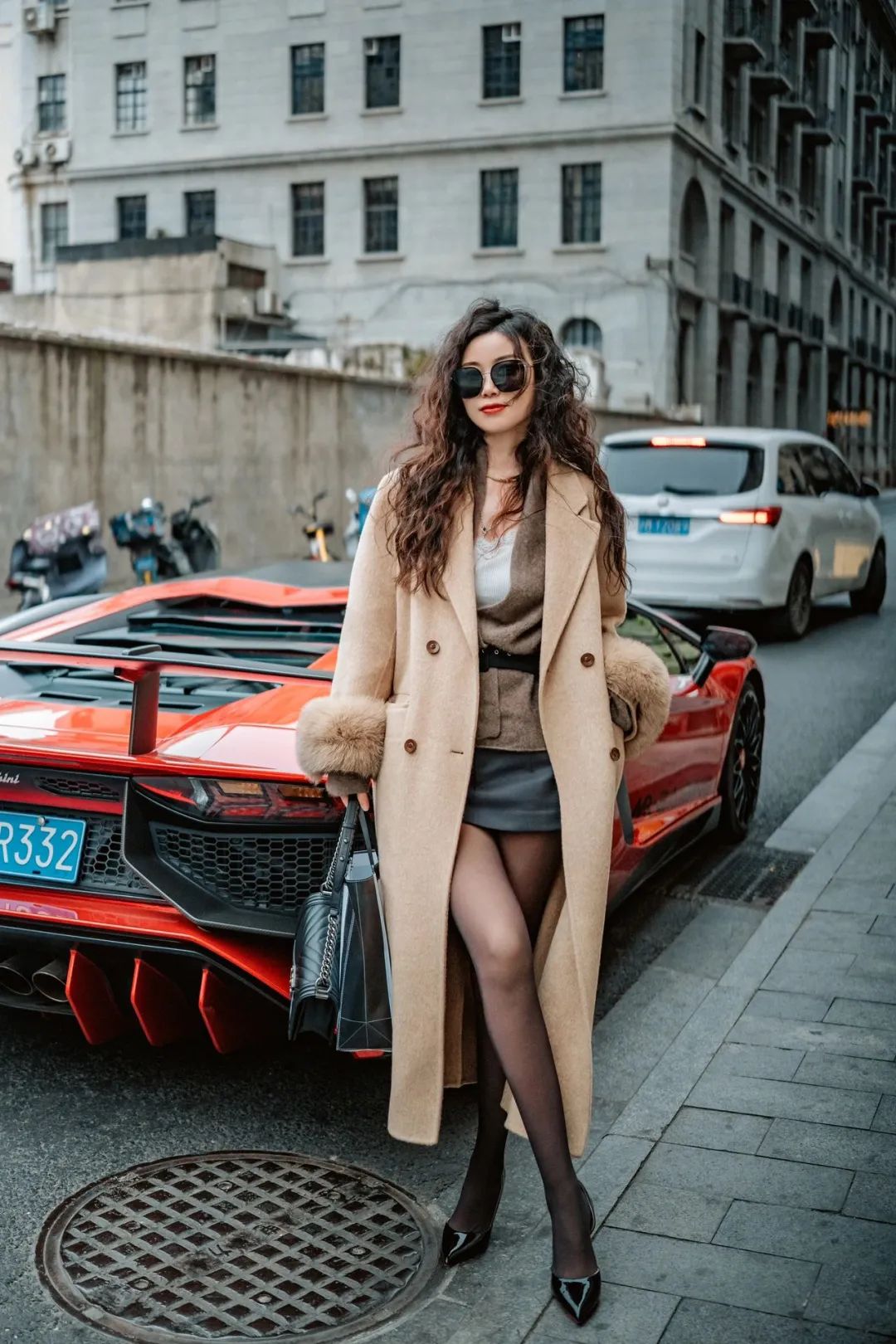 侧身倚靠在红色跑车上,双腿一前一后自然分开,一只手插在大衣口袋,另一只手拎着包自然下垂,这样的拍照姿势展现出优雅且放松的姿态,同时能够拉长腿部线条,使身材比例更显修长。