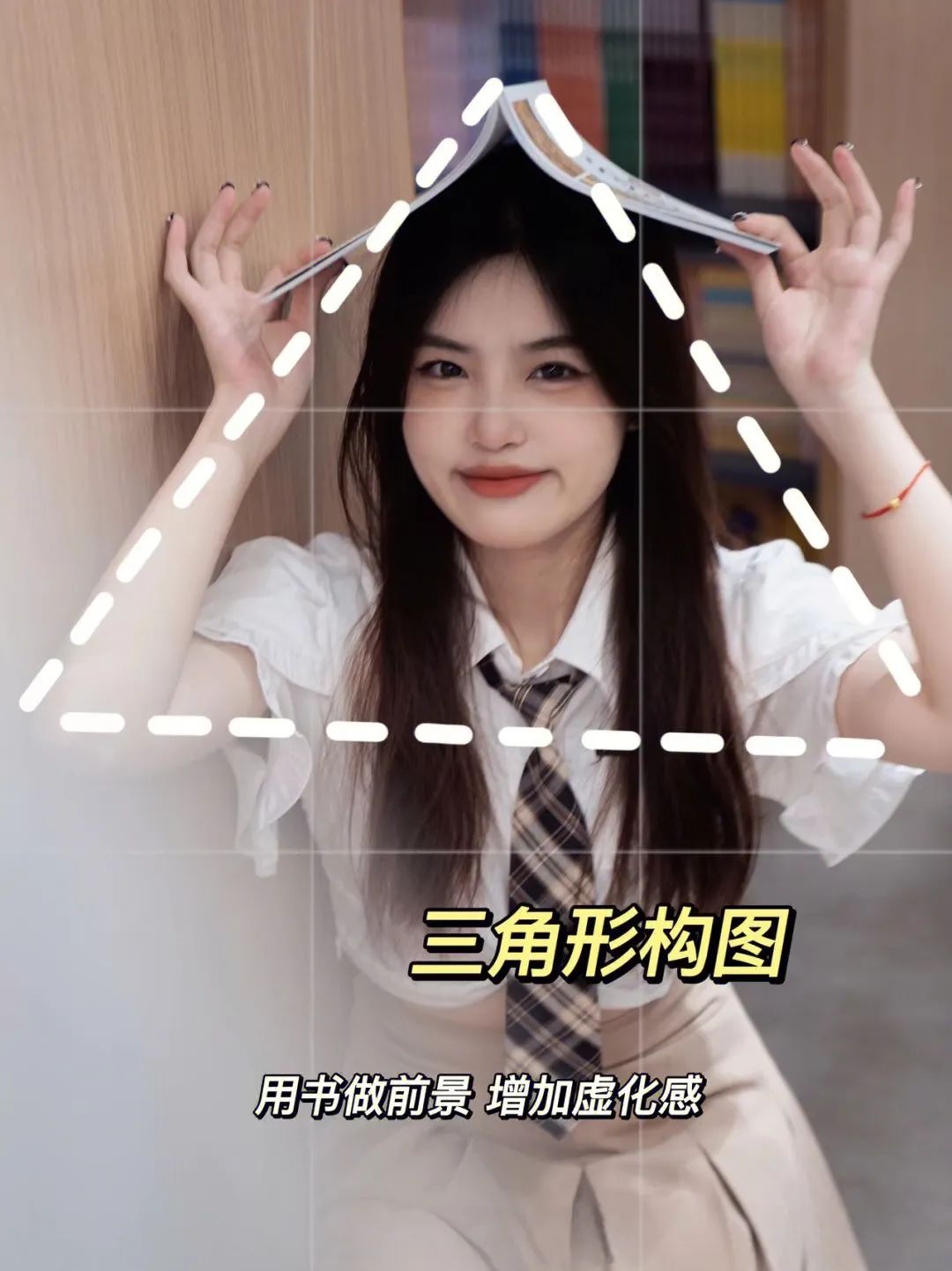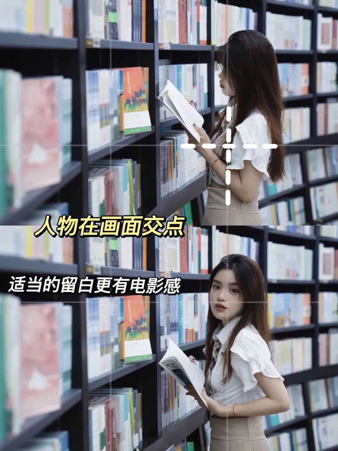 人物、书本、书架形成三角形构图✨ 小心机选择精装书更有质感,虚化程度要适中