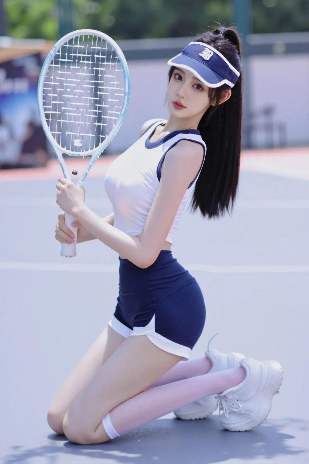 身体微微前倾,手持网球拍侧身跪地,头略抬起,眼神直视镜头,配合着马尾发型和运动装,展现出一种运动活力感,这样的拍照姿态既呈现出运动风采,又带有几分青春时尚感。