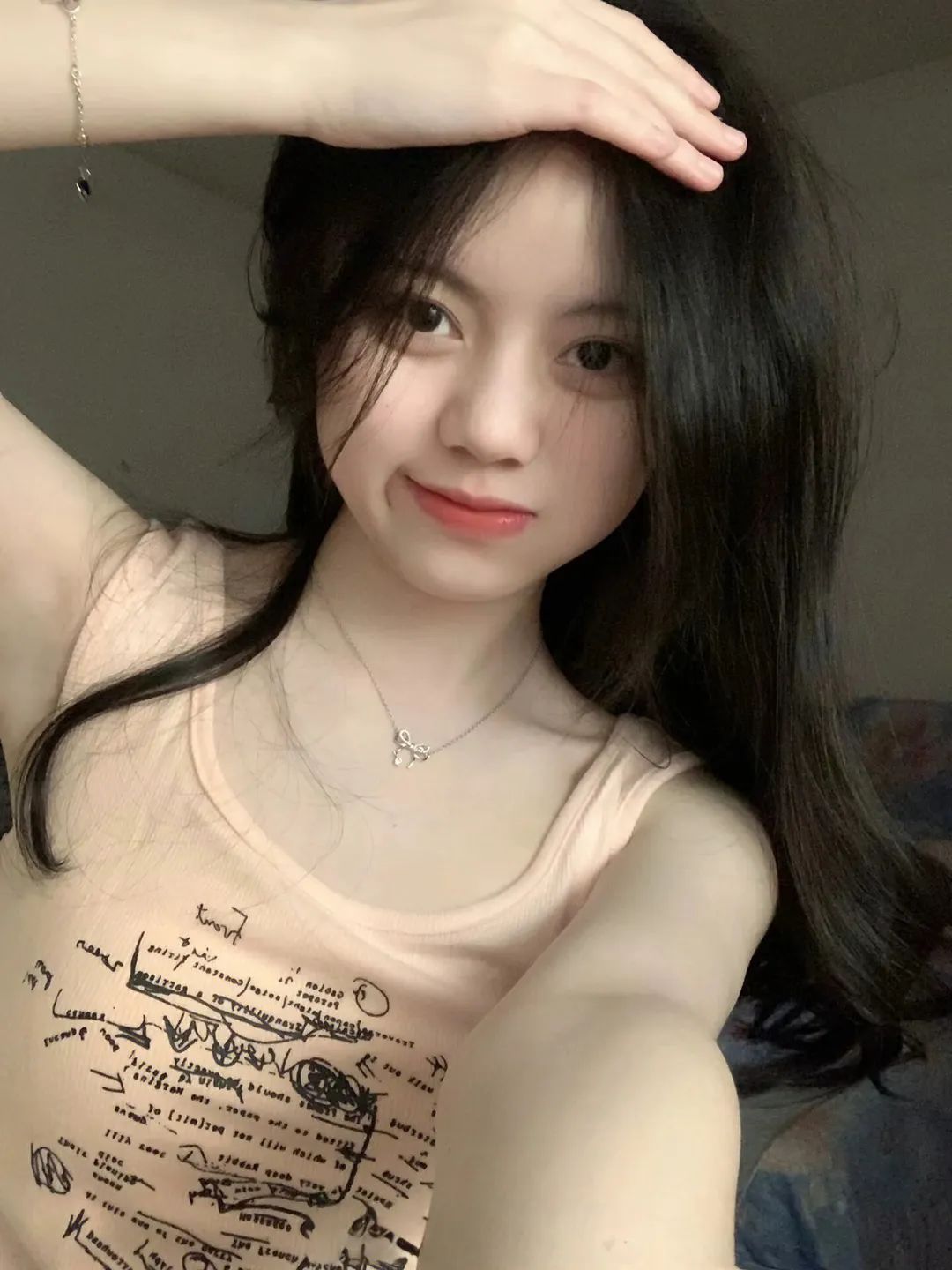 伸出手臂自拍,拉近与观者的距离。眼神直视镜头,双唇微张,表情略带俏皮与天真,整体姿势营造出一种亲近、自然的氛围,仿佛是在记录日常的随性瞬间,展现出青春的灵动与活力。