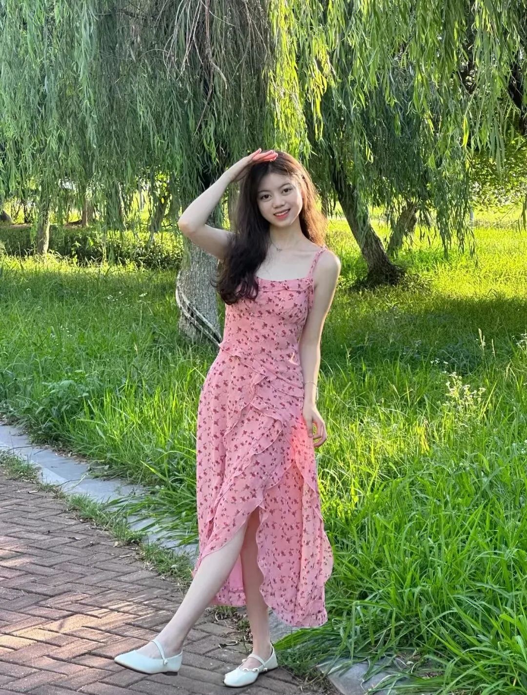 正面站立,身姿挺拔。双腿微微交叉,一只脚轻踮,自然地展现出优雅的姿态,同时让腿部线条更显修长。双手自然放置,一只手轻提裙摆,增添了几分灵动与俏皮,也凸显出粉色碎花裙的层次感。面带微笑,眼神明亮看向镜头,整个人显得自信且亲切。