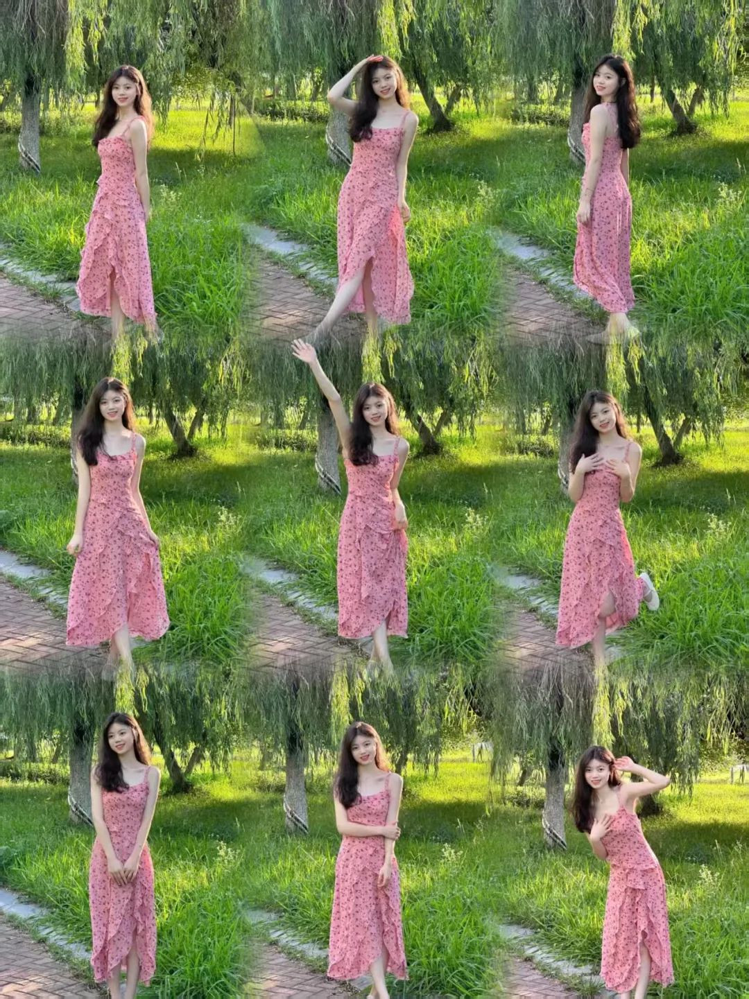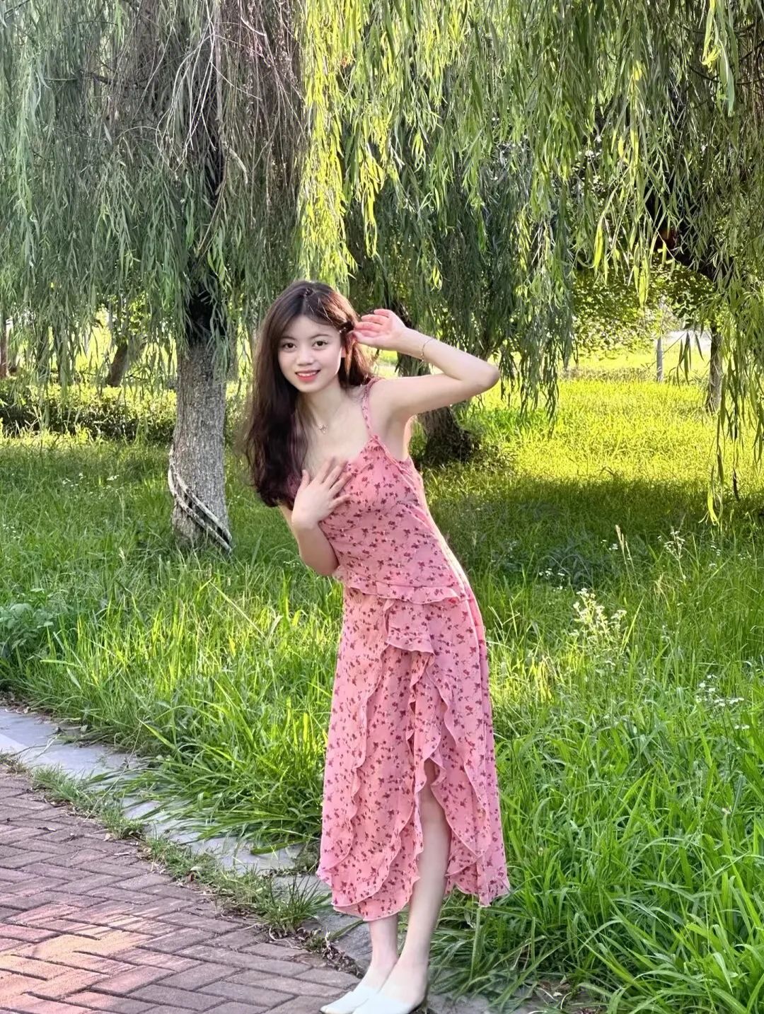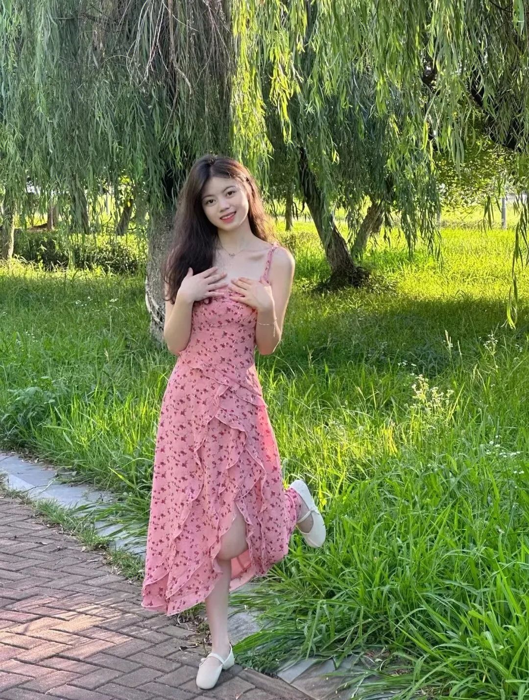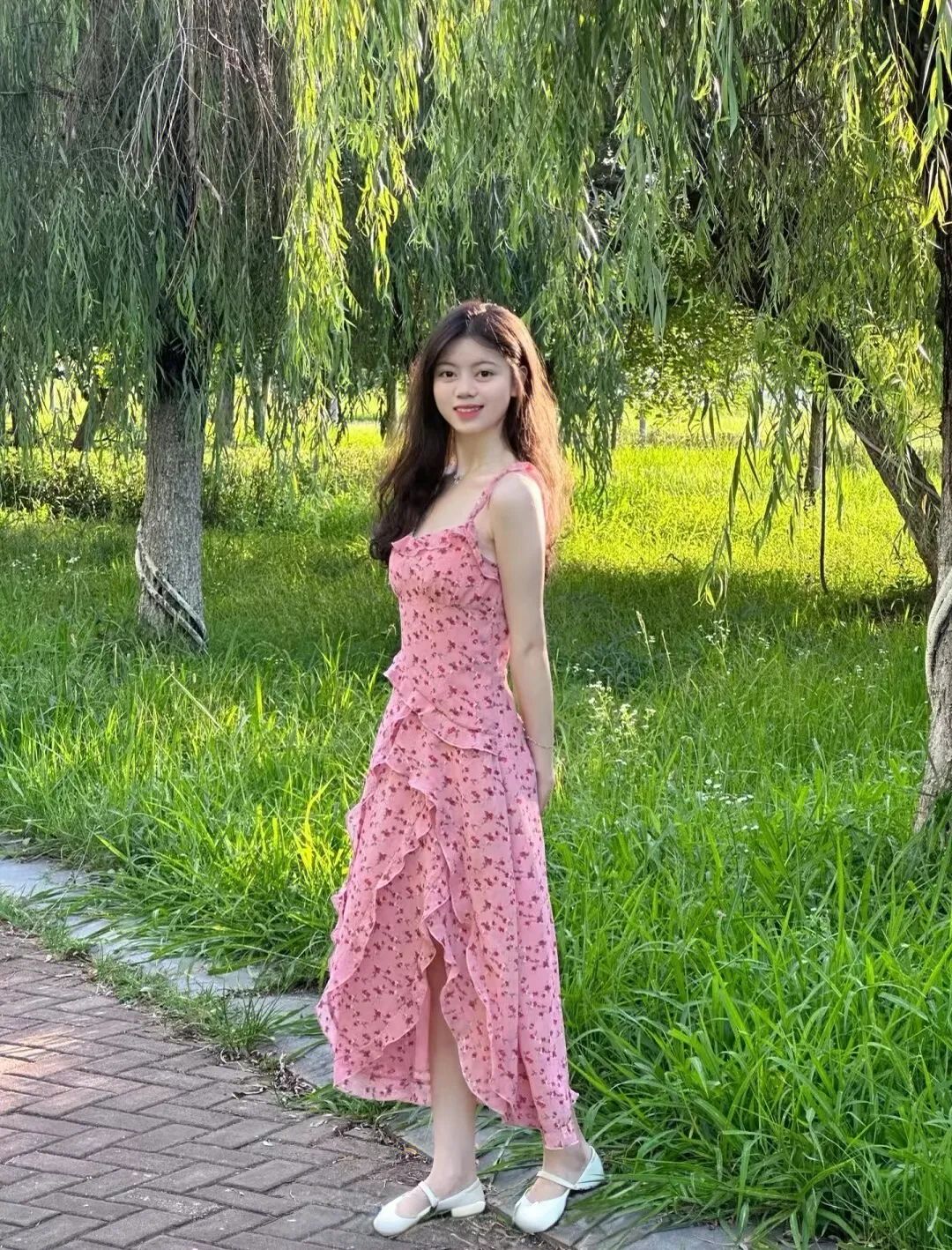 侧身站立,微微转头看向镜头,展现出自然甜美的微笑 。双手置于身后,凸显出放松的状态。这种姿势既展现了她的优雅气质,又通过侧身的角度,自然地展现出粉色碎花裙的层次感和身形曲线,显得身材修长