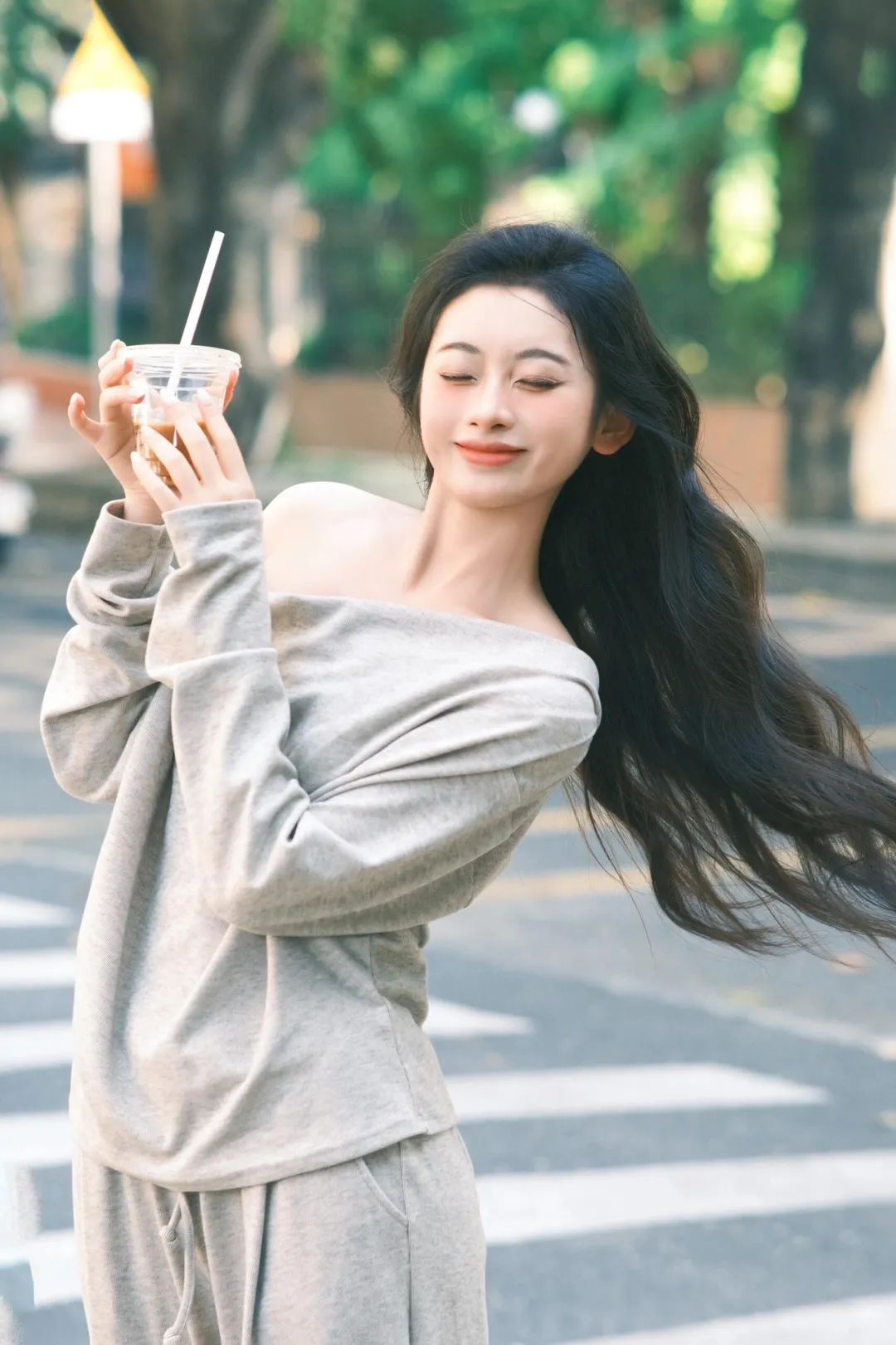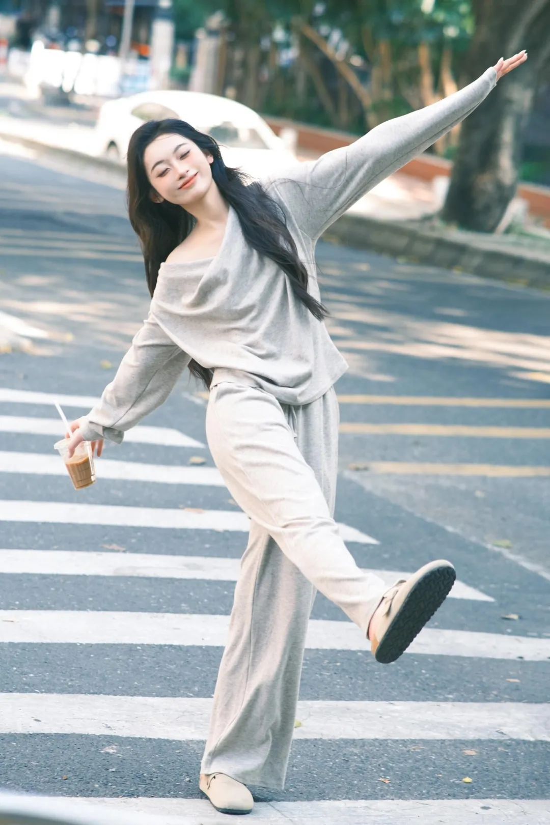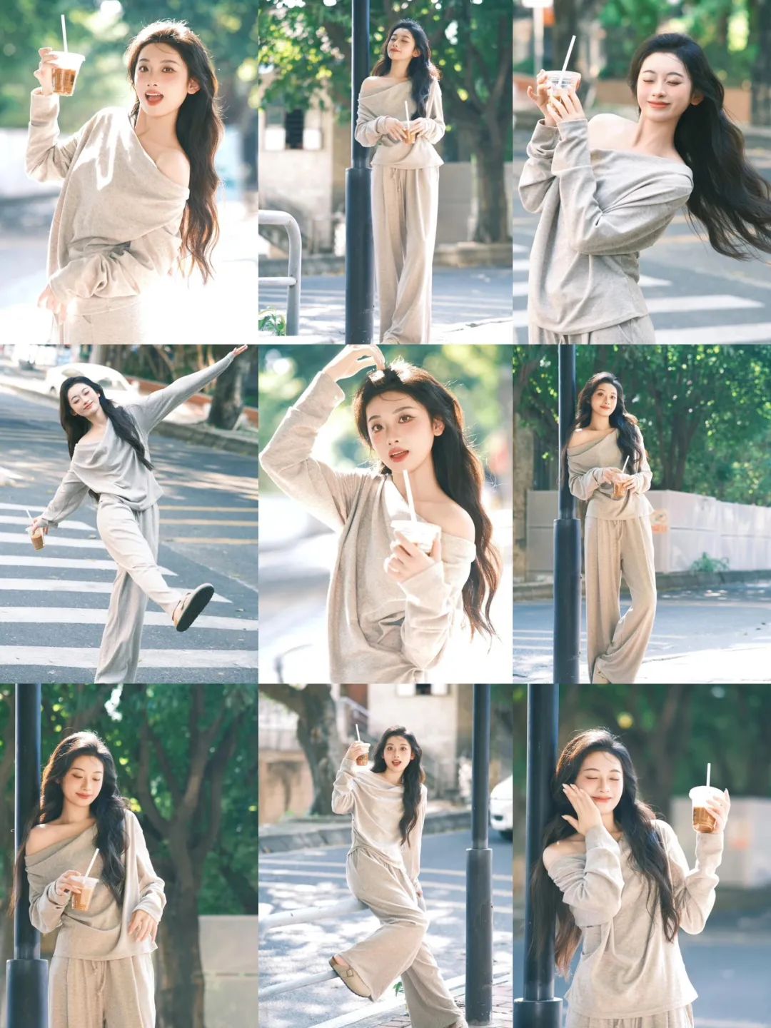 单腿高高抬起,一只手臂伸展向一侧,另一只手拿着一杯饮品,整体姿态呈现出一种自由自在、无拘无束的感觉,露肩上衣搭配宽松长裤,显得随性又舒适。拍照时,可以抓怕人物的表情!