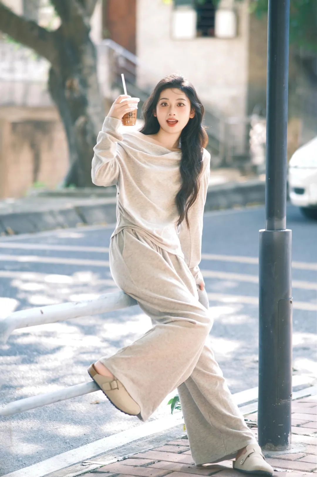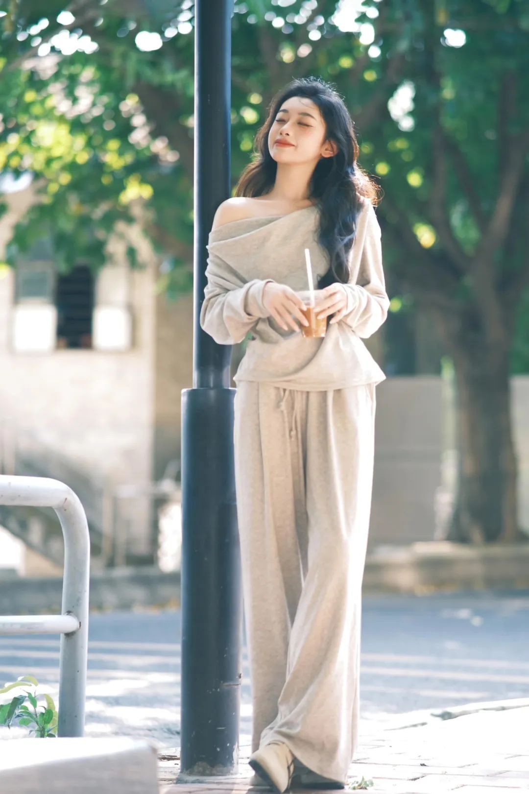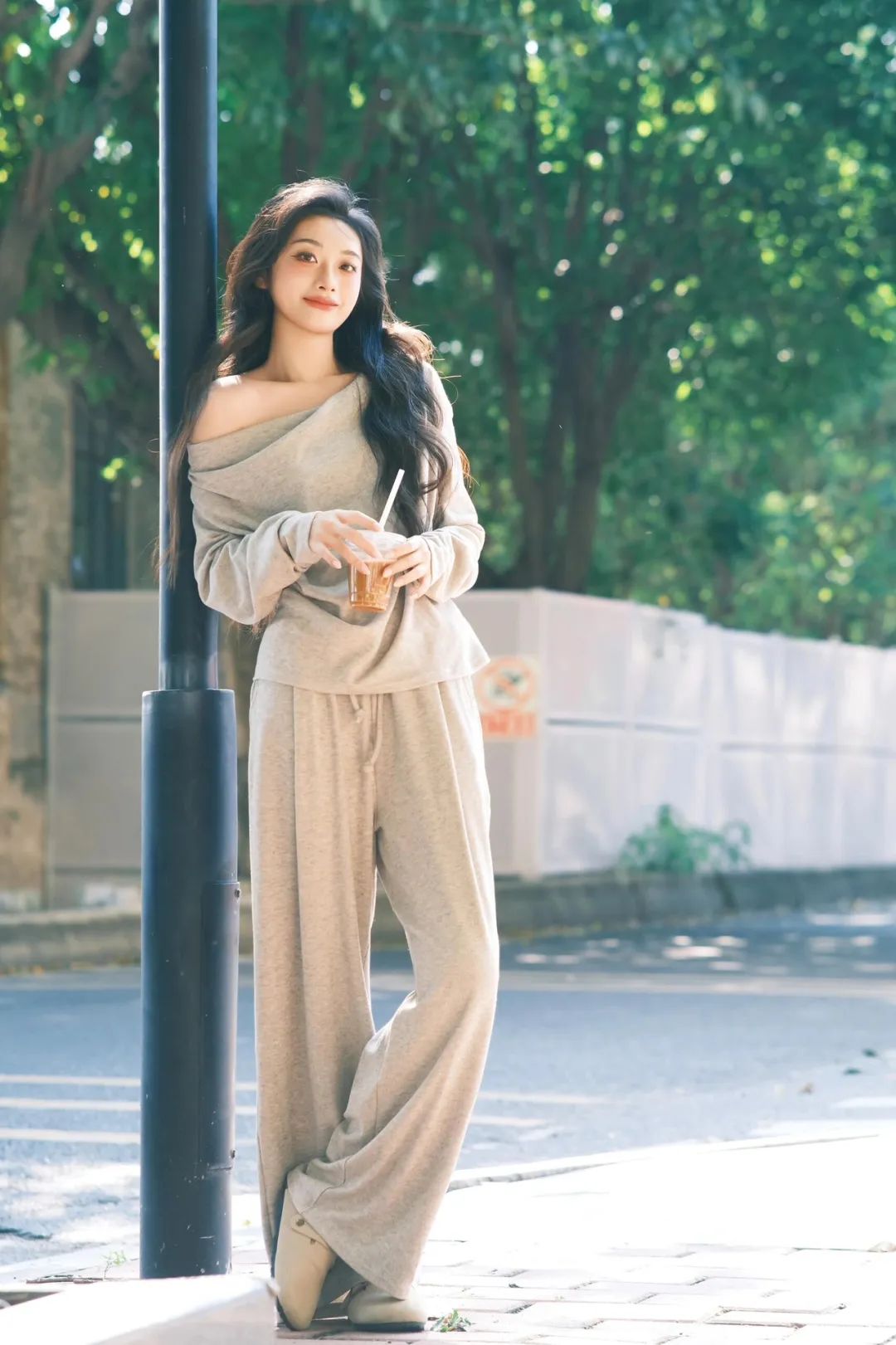 单腿高高抬起,一只手臂伸展向一侧,另一只手拿着一杯饮品,整体姿态呈现出一种自由自在、无拘无束的感觉,露肩上衣搭配宽松长裤,显得随性又舒适。拍照时,可以抓怕人物的表情!
