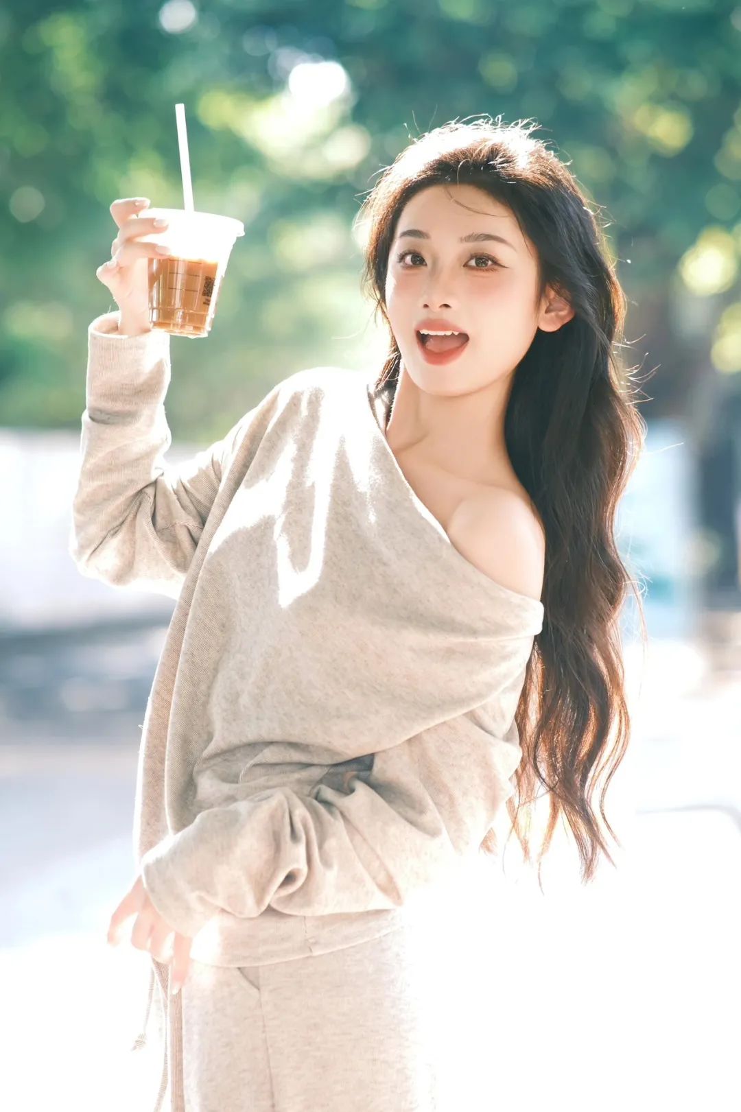 手拿咖啡面向镜头,一手轻撩头发,这样的拍照动作显得自然又随性,仿佛是不经意间的一个瞬间被捕捉下来,增添了画面的动感和柔美。