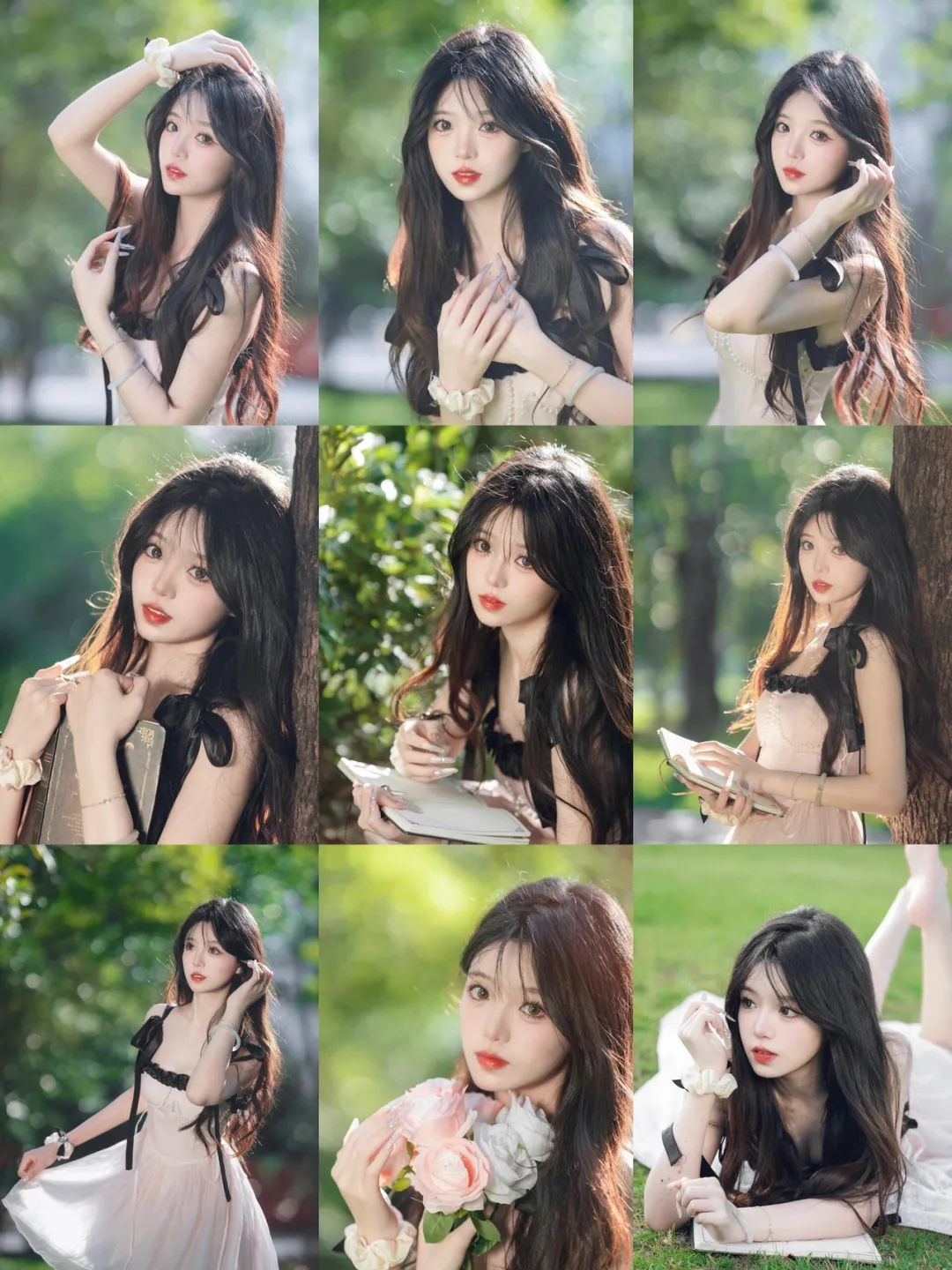 手持一本打开的书,手指轻放在书页上,倚靠在树干上,微微歪头眼神看向镜头,这种拍照姿势让人感到舒适,显得优雅且富有文艺气息。这样的拍照场景可以选择宁静的自然环境,如公园、森林或花园,来营造出这种悠闲、宁静的氛围。