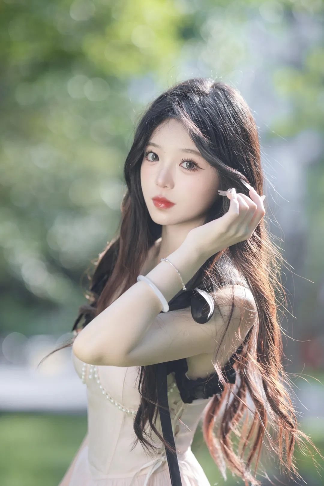手臂抬起放在头上轻触头发,另一只手臂自然下垂,身体略微向一侧倾斜,头微微倾斜,眼睛看向镜头,给人一种亲切和自信的感觉。这种拍照姿势不仅显得自然随意,还能很好地展示手臂和手腕上的配饰。拍照时,可以使得背景的绿色植物变得模糊,从而突出人物的主体地位。