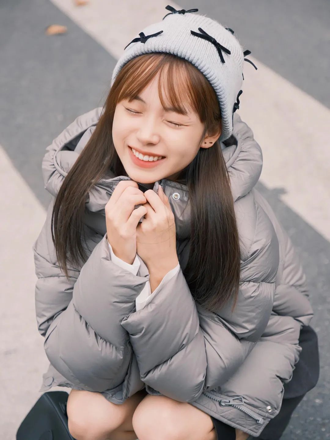 坐在地上,双腿自然弯曲,手抬起放在头上轻轻抓帽子,微微嘟嘴看镜头,给人一种可爱和俏皮的感觉。这样的拍照姿势给人一种自然、不做作的感觉,同时也能够很好地展示人物的衣着和配饰。