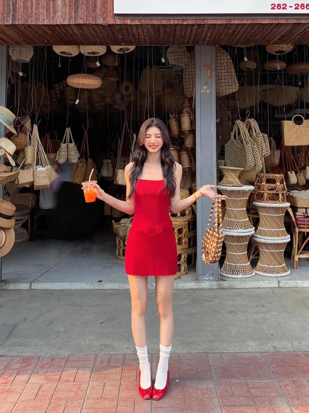 一只脚抬起外展,另一只脚稳稳地站立,手俏皮地放在嘴边,轻轻捂嘴微笑,另一只手自然下垂。这种姿势不仅增加了照片的活力,还展现出人物的俏皮与灵动。头上戴着一朵鲜艳的红色花朵,与人物身上的红色连衣裙相互呼应,形成了一种和谐的整体感。