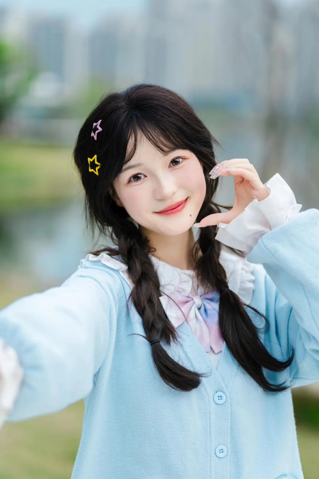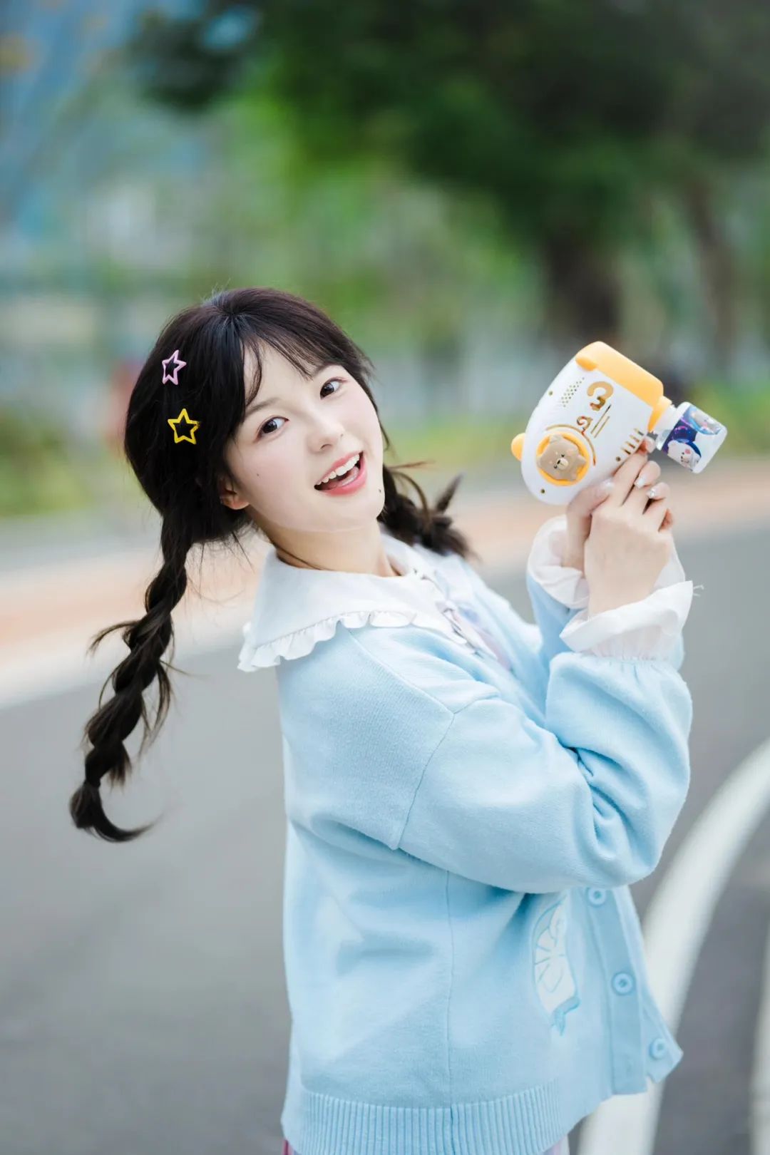 双手将泡泡机高高托起,上半身微微向前倾,姿态活泼灵动,这一小小的动作展现出了一种充满活力的活泼姿态,为整个拍照画面增添了动感与俏皮。辫子与彩色星星发饰相得益彰,增添了可爱的韵味。