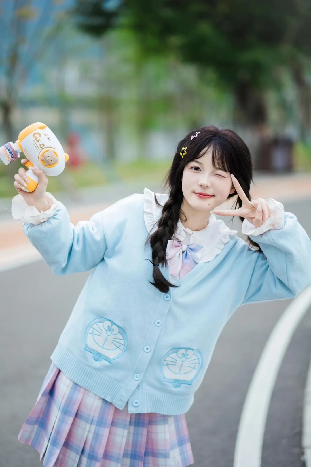 单手拿着一个可爱泡泡机,另一只手俏皮地比出比耶手势放在脸旁,这一动作给人带来满满的童真和趣味感。上半身轻轻地向一侧倾斜,展现出一种充满活力的姿态,为整个拍照画面增添了更多的动感元素。