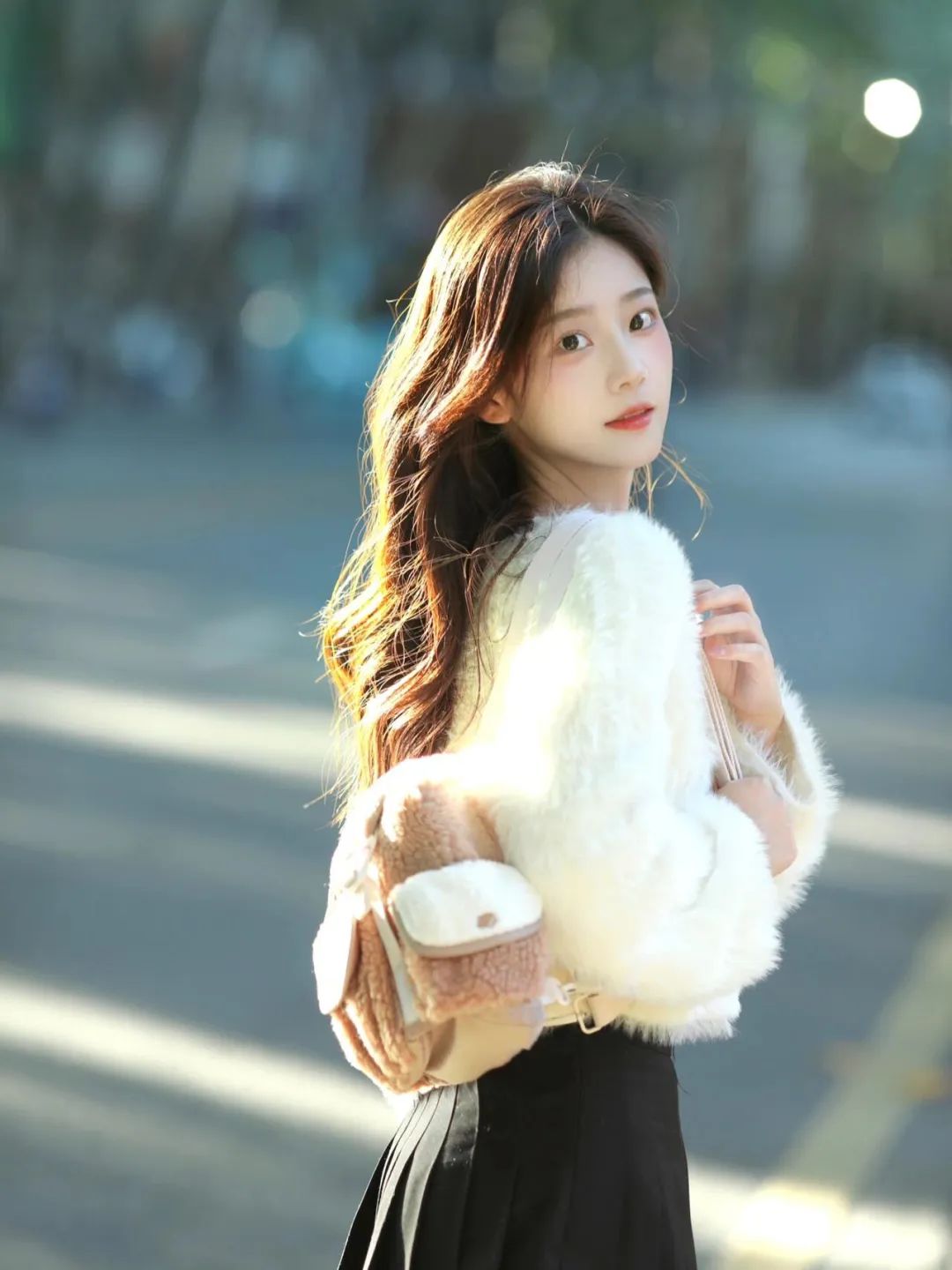 单腿屈膝下蹲,另一条腿则自然地伸展着,白色的毛绒外套与黑色裙子形成了鲜明的对比,更加突出了整体造型的层次感。拍照时引导人物保持自然而轻松的表情,与姿势相得益彰,展现出更加随性可爱的一面,注意捕捉人物的动态瞬间,让照片更加生动有趣。