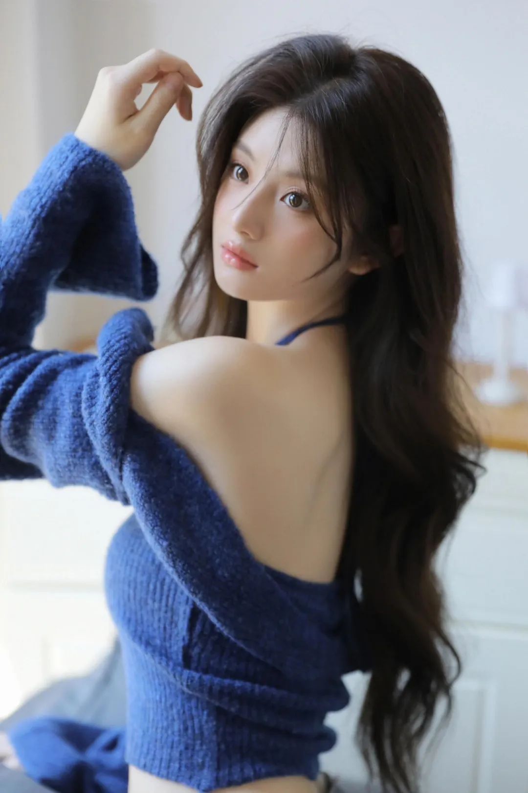 侧身站立手轻轻拉住露肩毛衣的一角,手指自然地捏着毛衣的边缘,肩膀微微向后倾斜,露出光滑的背部和一部分香肩,性感而不失优雅。毛衣的宽松袖口微微堆积在手臂上,形成自然的褶皱,增添了一种慵懒随性的感觉。