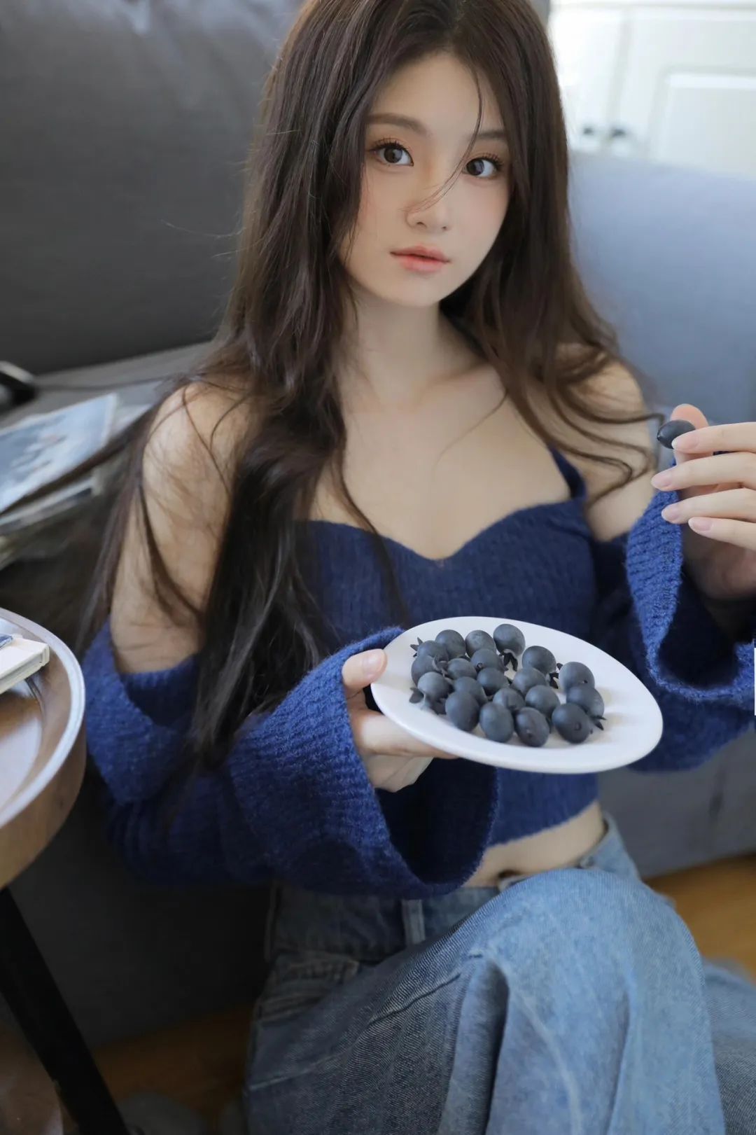 侧身坐在沙发上,左手轻轻抬高,微微侧头,眼神直视镜头,目光坚定,露肩的蓝色毛衣搭配牛仔裤,展现出迷人的锁骨和肩线,这样的拍照姿势和造型休闲又时尚,既舒适又不失格调。
