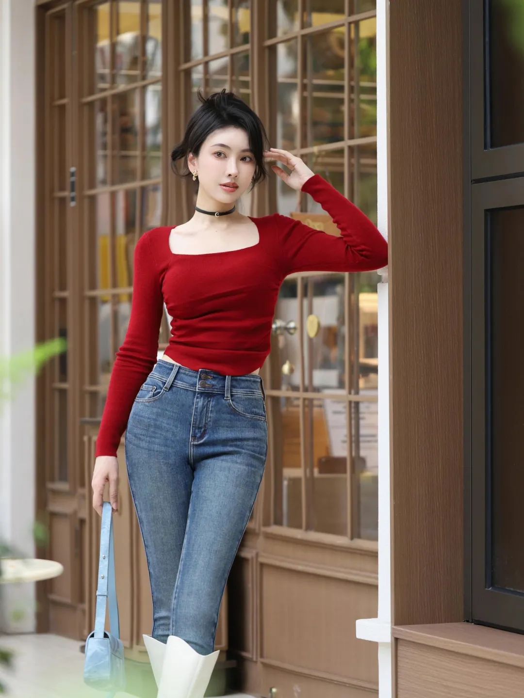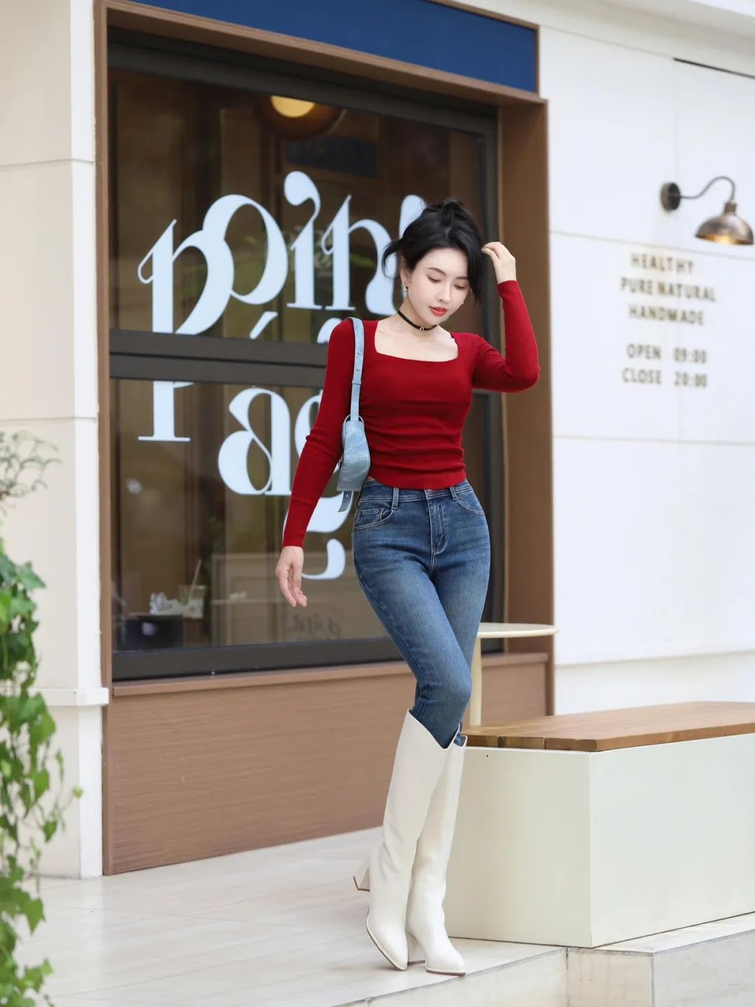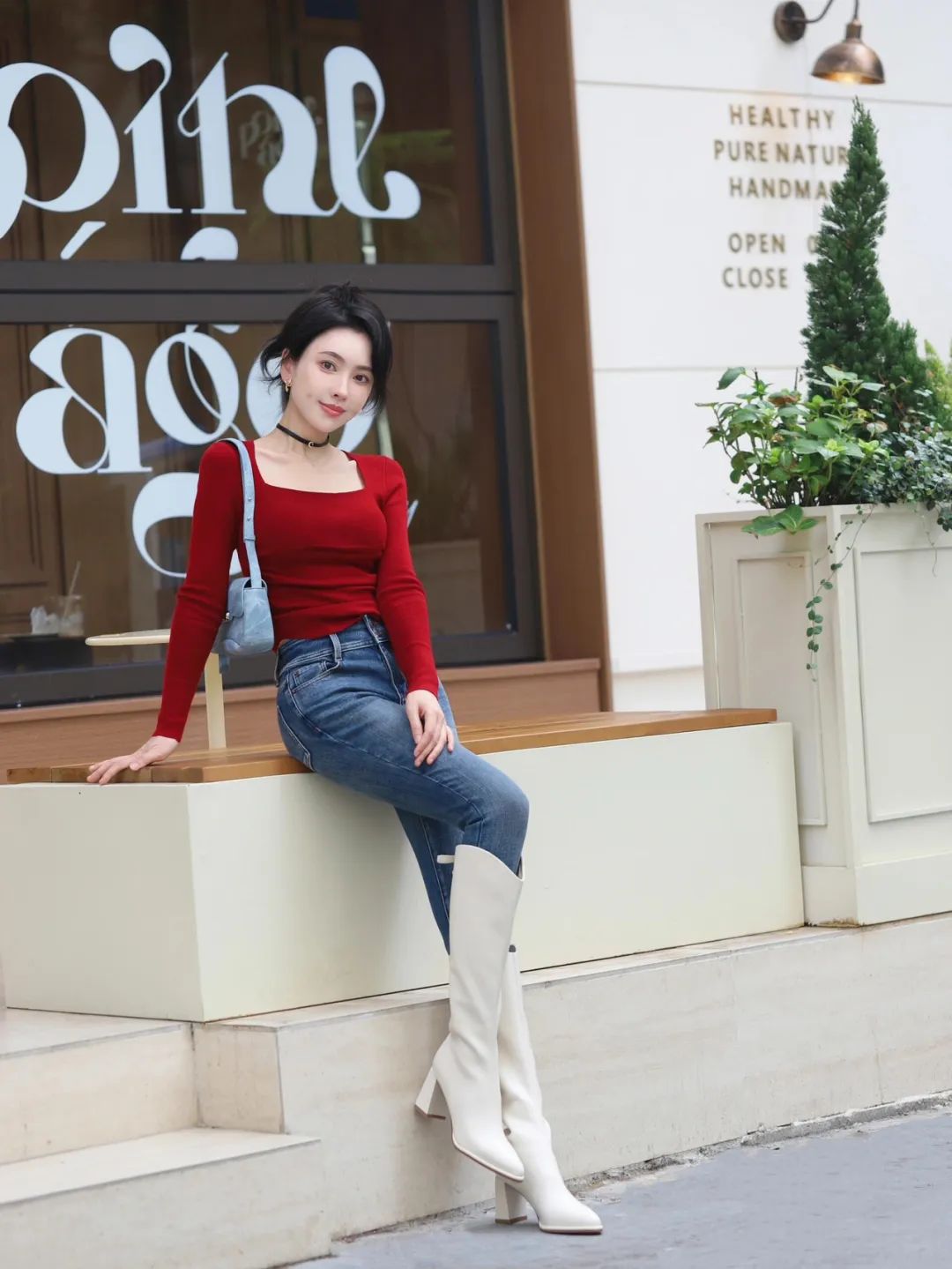 坐在白色长凳上,双手自然地交叉放在胸前,头部微微转向一侧,目光看向镜头,身上的红色紧身短款上衣,可以将身材曲线勾勒得淋漓尽致,可以凸显出迷人魅力。搭配的蓝色牛仔裤和白色高筒靴,更是为整个造型增添了一份时尚感和休闲气息。这样的拍照姿势能够很好地展示出修身的体态和手臂的线条。