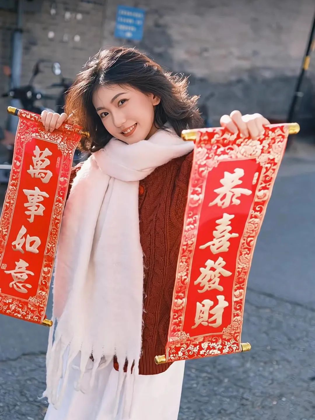双手各持一个红色的春联,歪着头看向镜头前方面带微笑,这个动作在拍照中显得自然且充满喜庆。拍照时,可以注意捕捉人物的眼神和表情,以及春联上的细节,这样可以让照片更加生动、有趣,富有感染力。