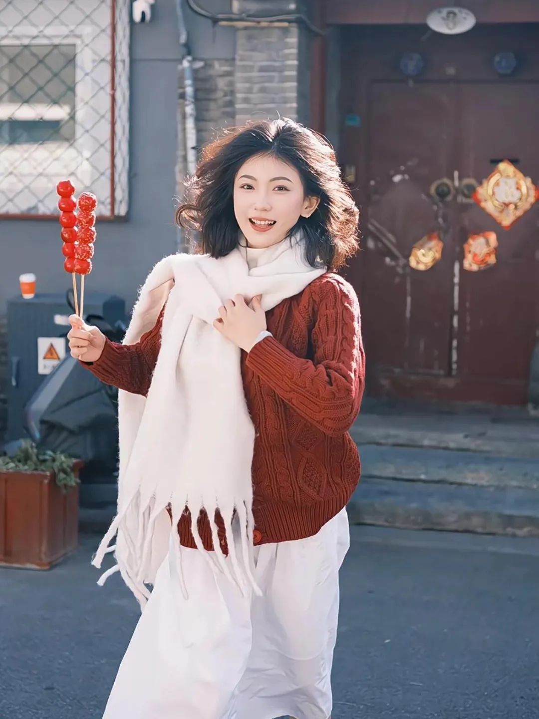 手持糖葫芦,侧身站立回眸看向镜头,脸上带着一丝微笑,显得十分亲切,整个姿态自然且放松。搭配红色毛衣和白色围巾为整体拍照增添了一份温馨。同时,运用运用合适的光线和角度,抓拍更能捕捉人物脸上的微笑和自然的姿态。