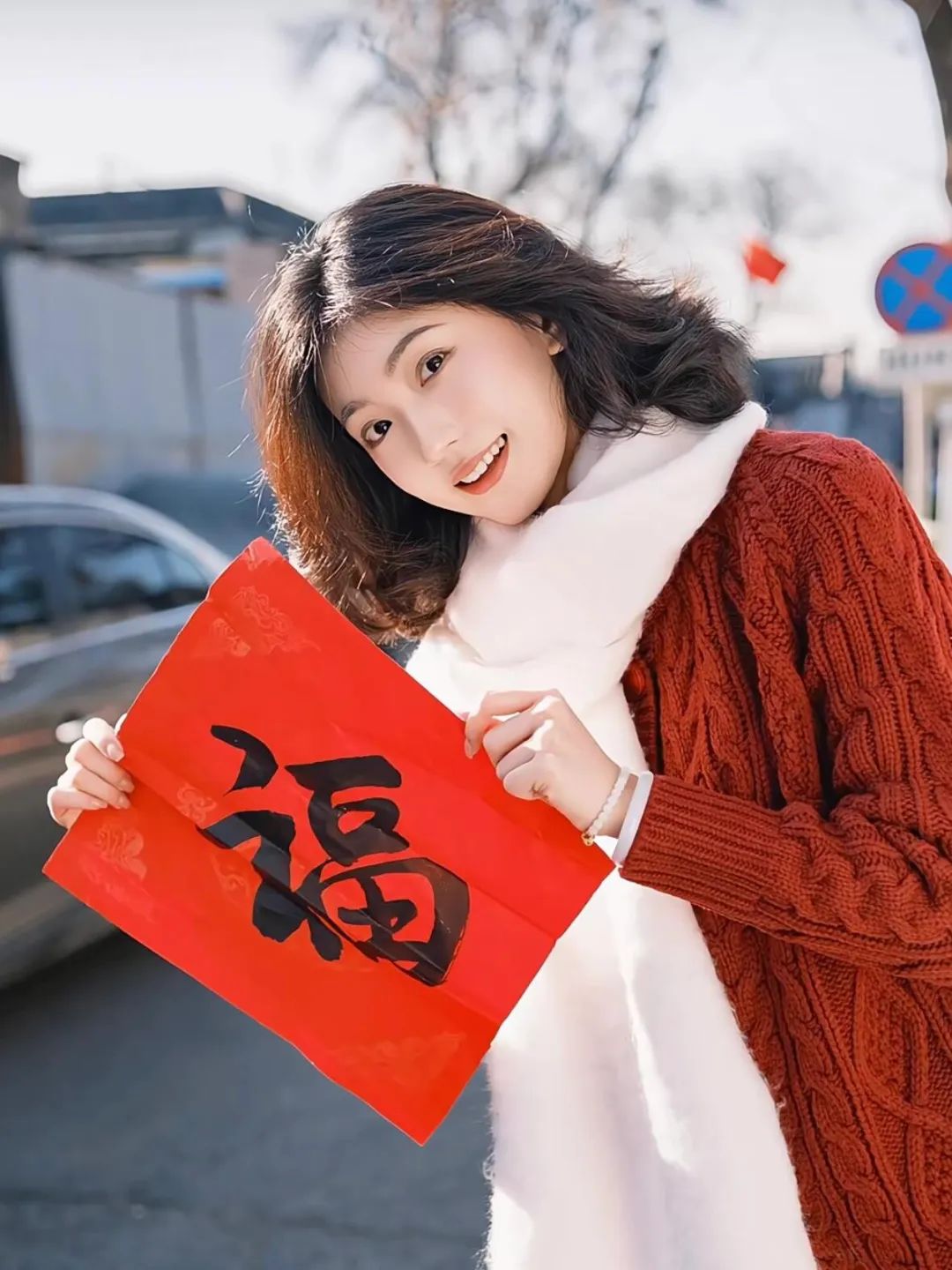 手持一个鲜艳的红色“福”字,头稍稍歪向一侧,眼神温柔地看向镜头,给人一种亲切而迷人的感觉。在拍摄时,可以选择一个简洁而有特色的背景,突出人物和“福”字的重要性。注意光线的运用,可以使人物的面部明亮而清晰,从而更好地展现出拍照的表情。