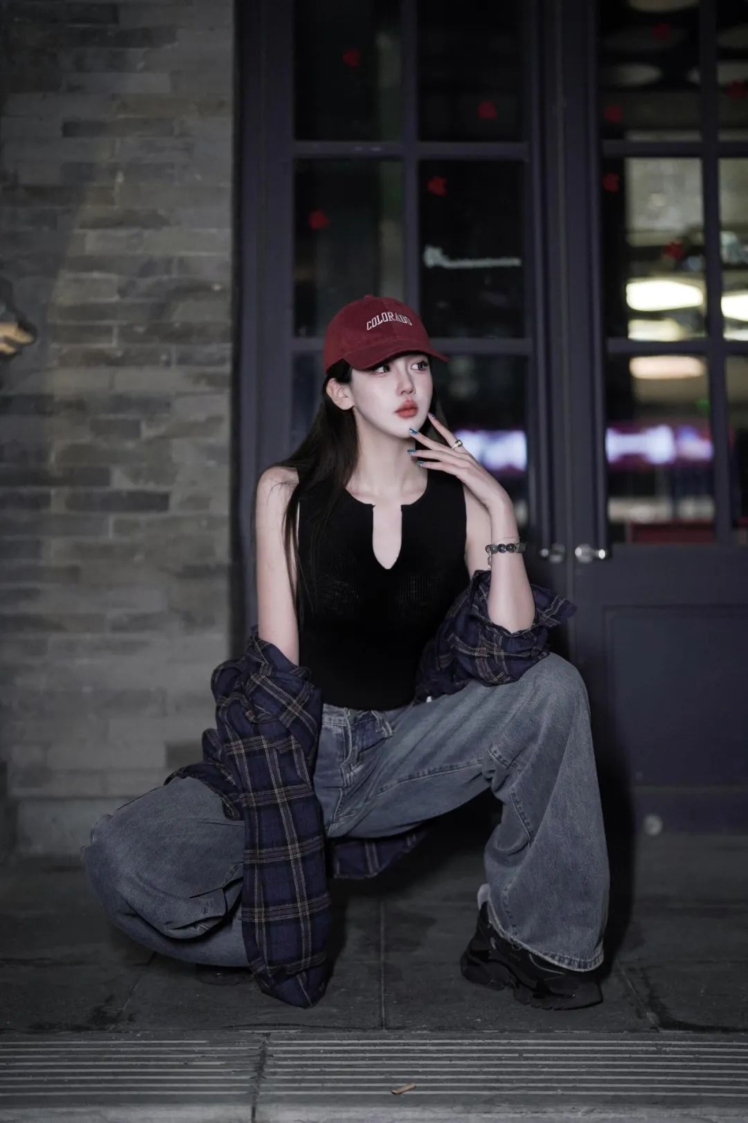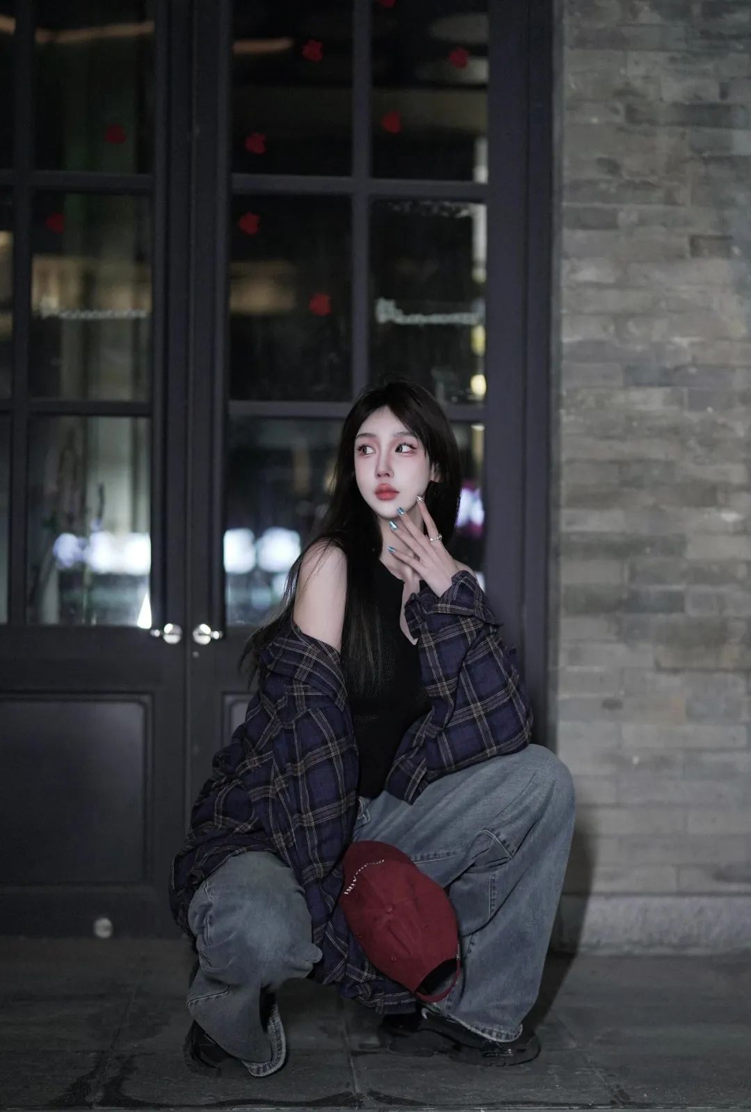辣妹蹲在夜景街头,像是一颗燃烧的火种,点燃了整个夜晚的激情。