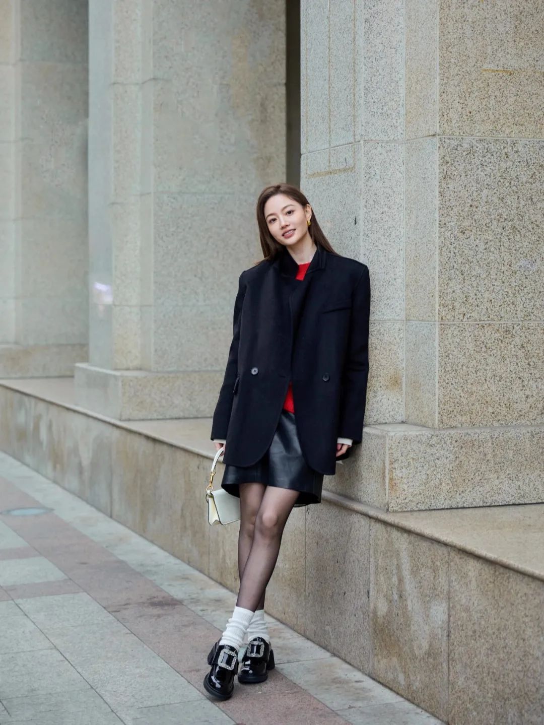 “西装连衣裙+黑丝”,这样穿时髦又高级!