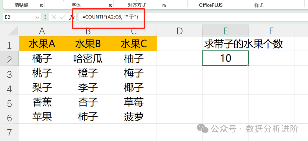 假如有一组数据如下,现在要统计带“子”的水果个数,此时则可以使用公式=COUNTIF(A2:C6, "*子"),*为通配符,表示任意字符。*可以根据需求,单放在前面(如"*子"),也可以放后面(如"A*"),还可以放两边(如"*A*")。