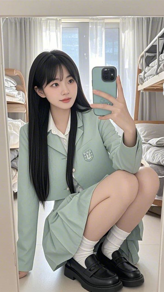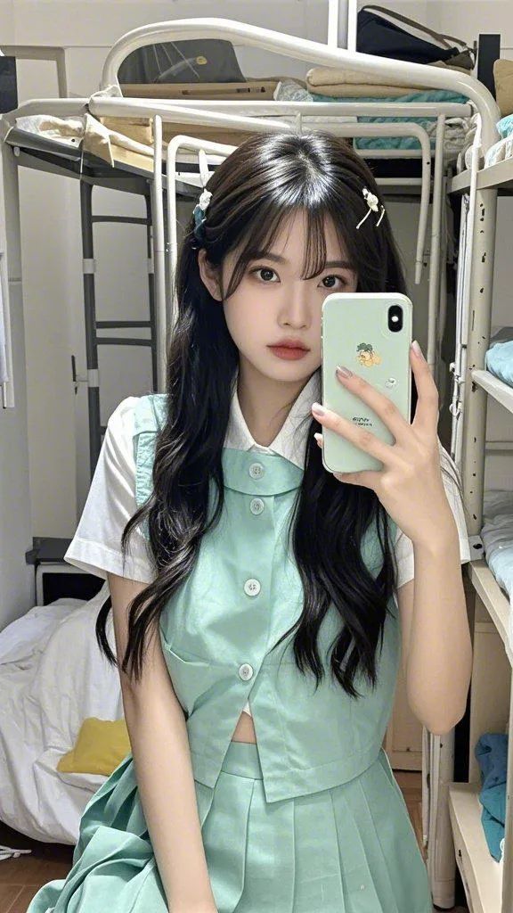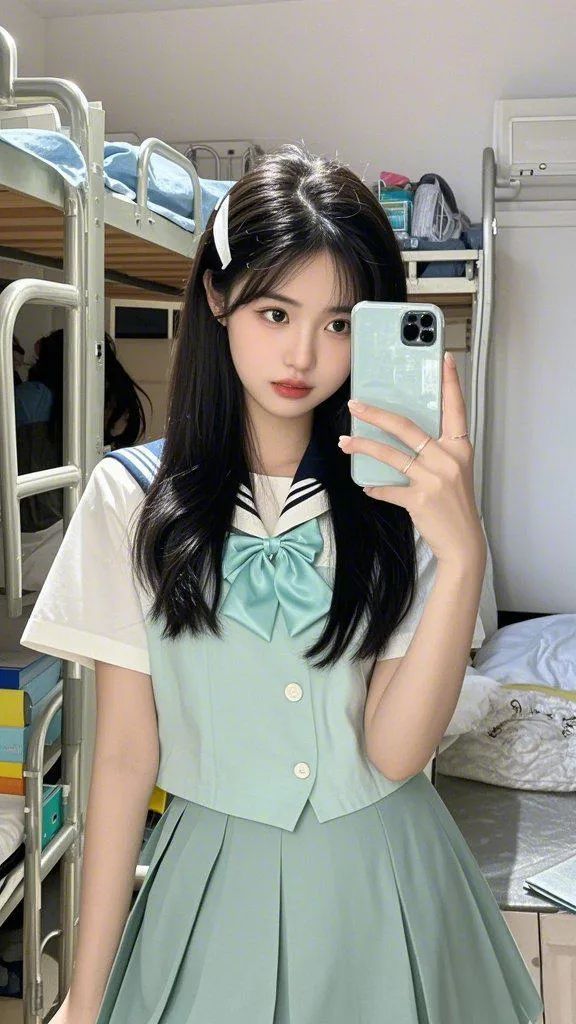 女大学生,穿薄荷绿JK,在寝室在自拍