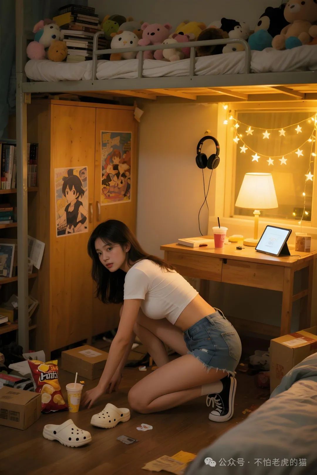 小文看见了什么?一套上床下桌的家具,床上堆满了小娃娃和几本书。桌子上有一盏台灯、一个平板电脑和一大包薯片。床下还挂着一串五角星形状的彩灯。地上散落着一下个人物品。