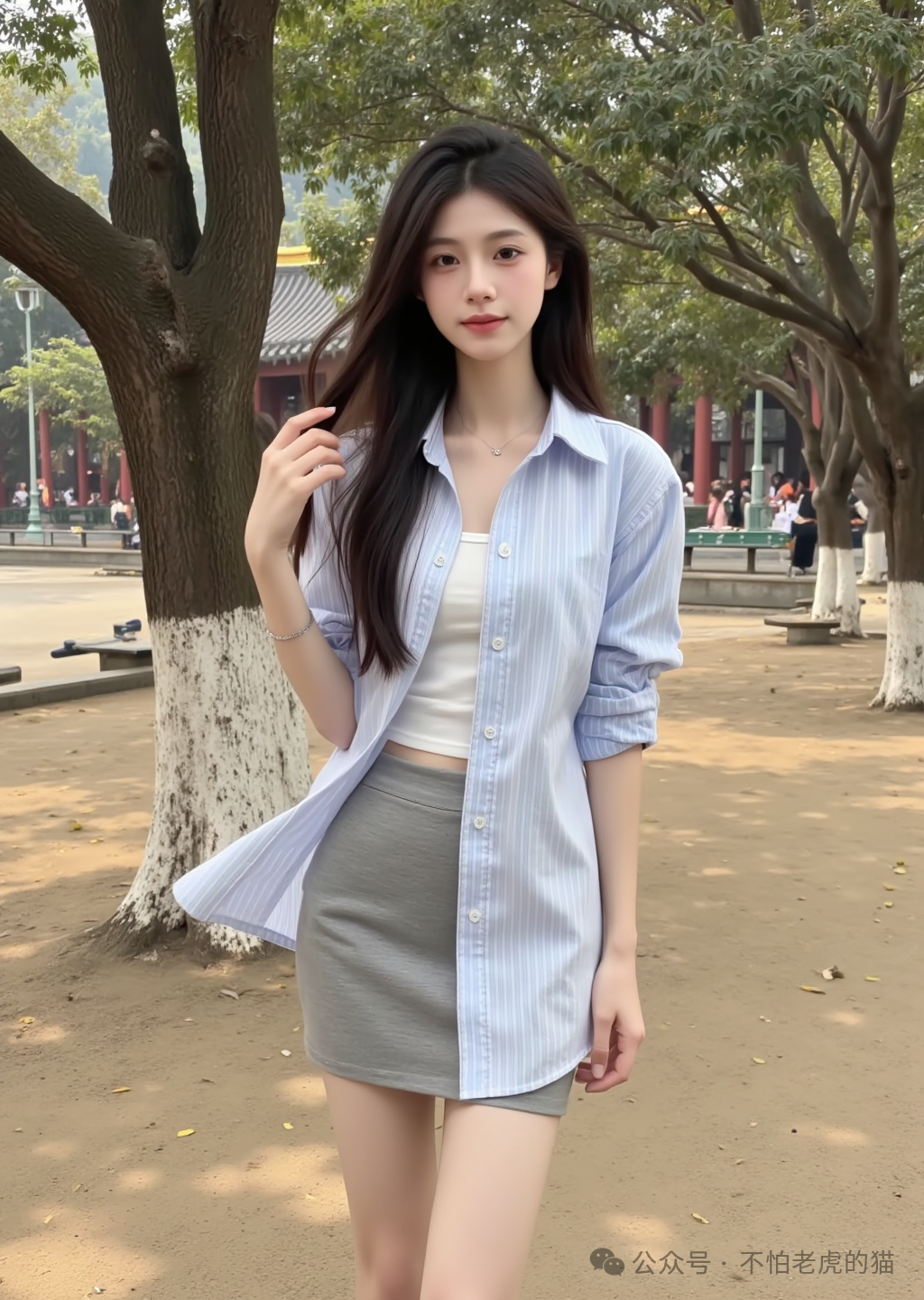 美少女春游踏青,就这样穿 艺帆风顺 发布于 2025-04-21 30 次阅读 穿上淡蓝色条纹衬衣,内搭白色小吊带,再加上包臀裙和小白鞋,美少女就可以出去玩了。走累了,在石凳上坐一会儿。这里的树好高啊。树周围都是泥土地。