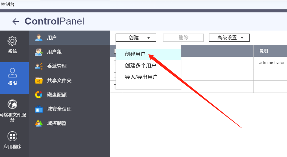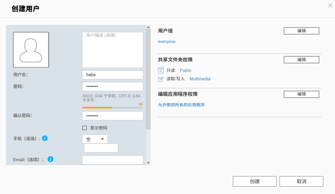设置账户名称和密码,以及右边的共享文件夹权限,这个权限设置可以等到后面共享文件夹创建完成后再设置。
