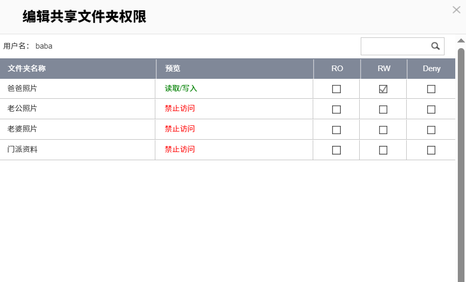 账号权限设置,以“baba”账号为例,只可以读取/写入【爸爸照片】文件夹。给新手朋友再介绍下右上方的英文。Ro=只读、RW=读取/写入,Deny=拒绝。其它账户依次按照上述内容。