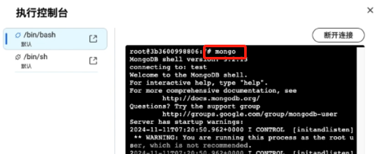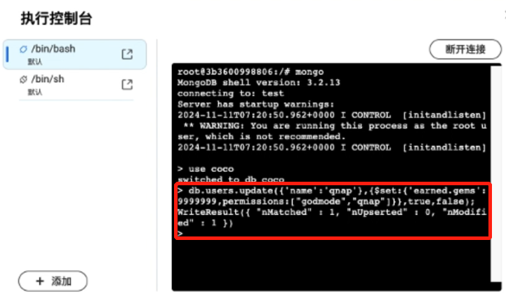 接着再返回容器按照下图指示依次点击【执行】→【/bin/bash】→【执行】。