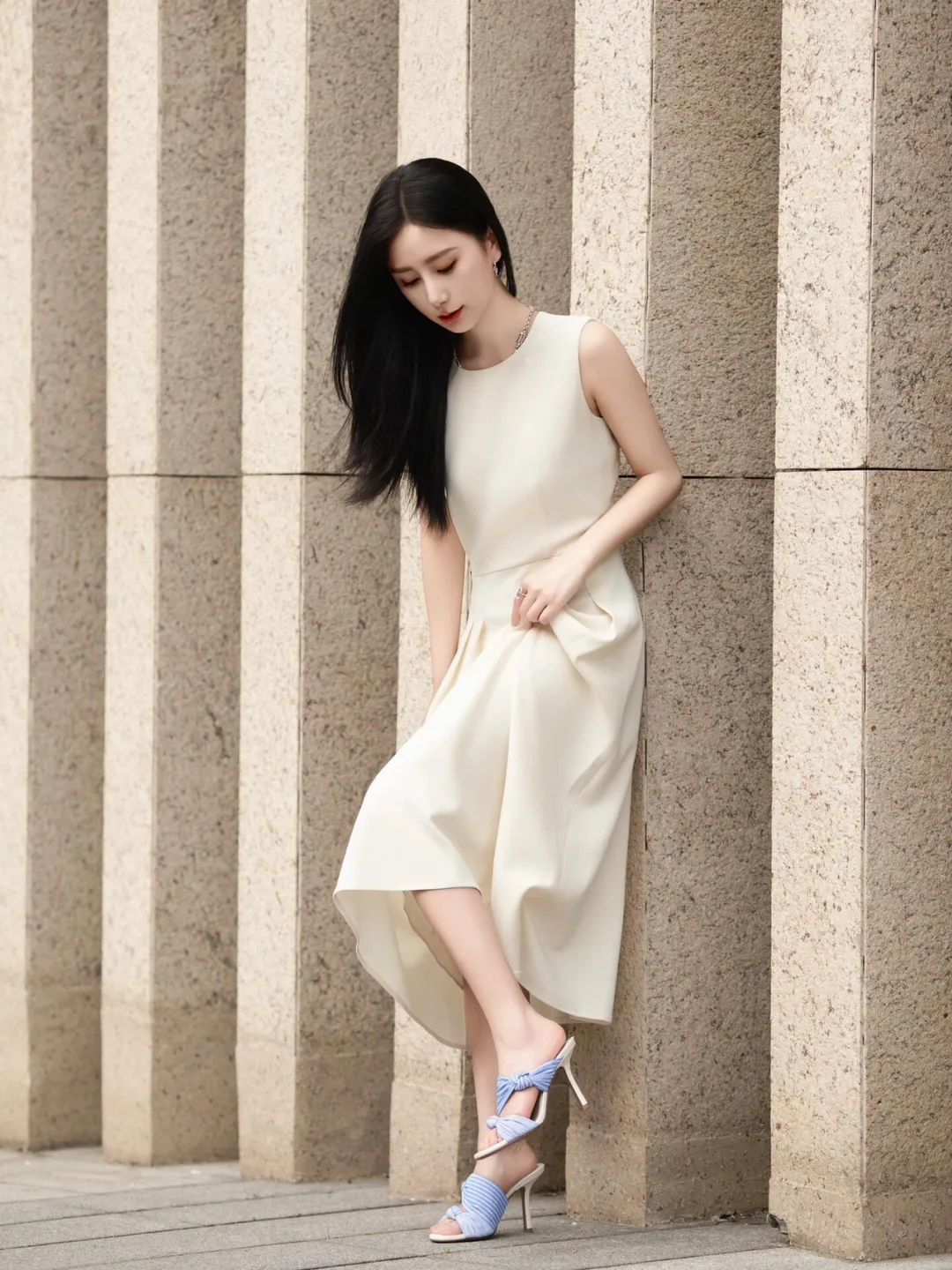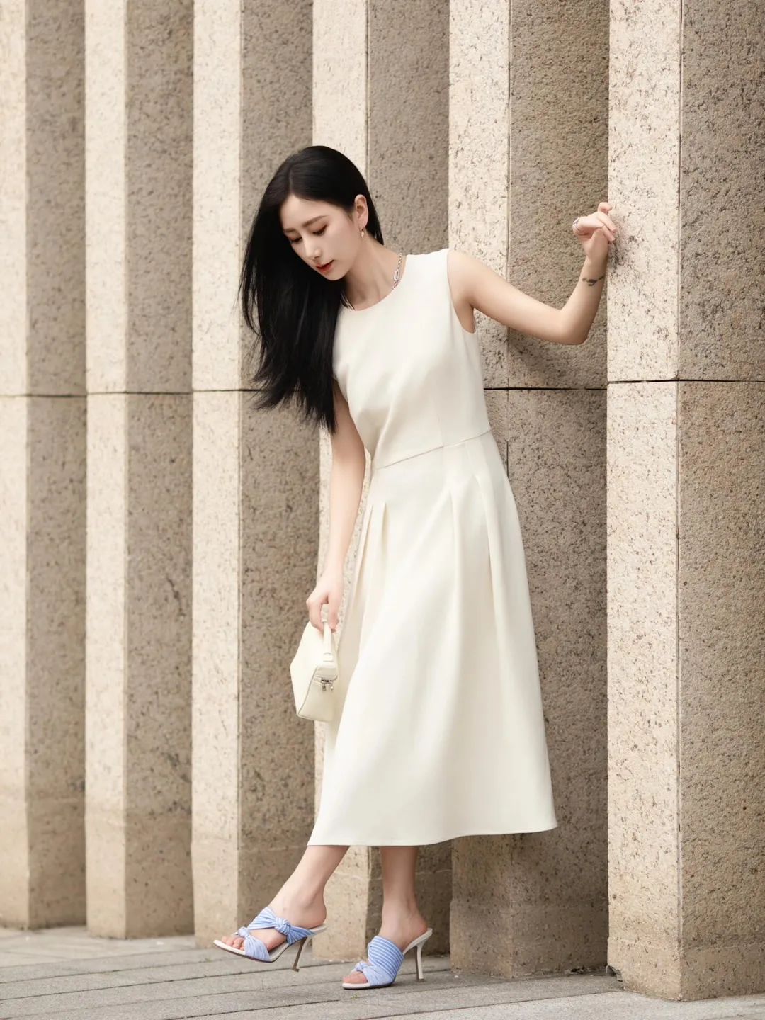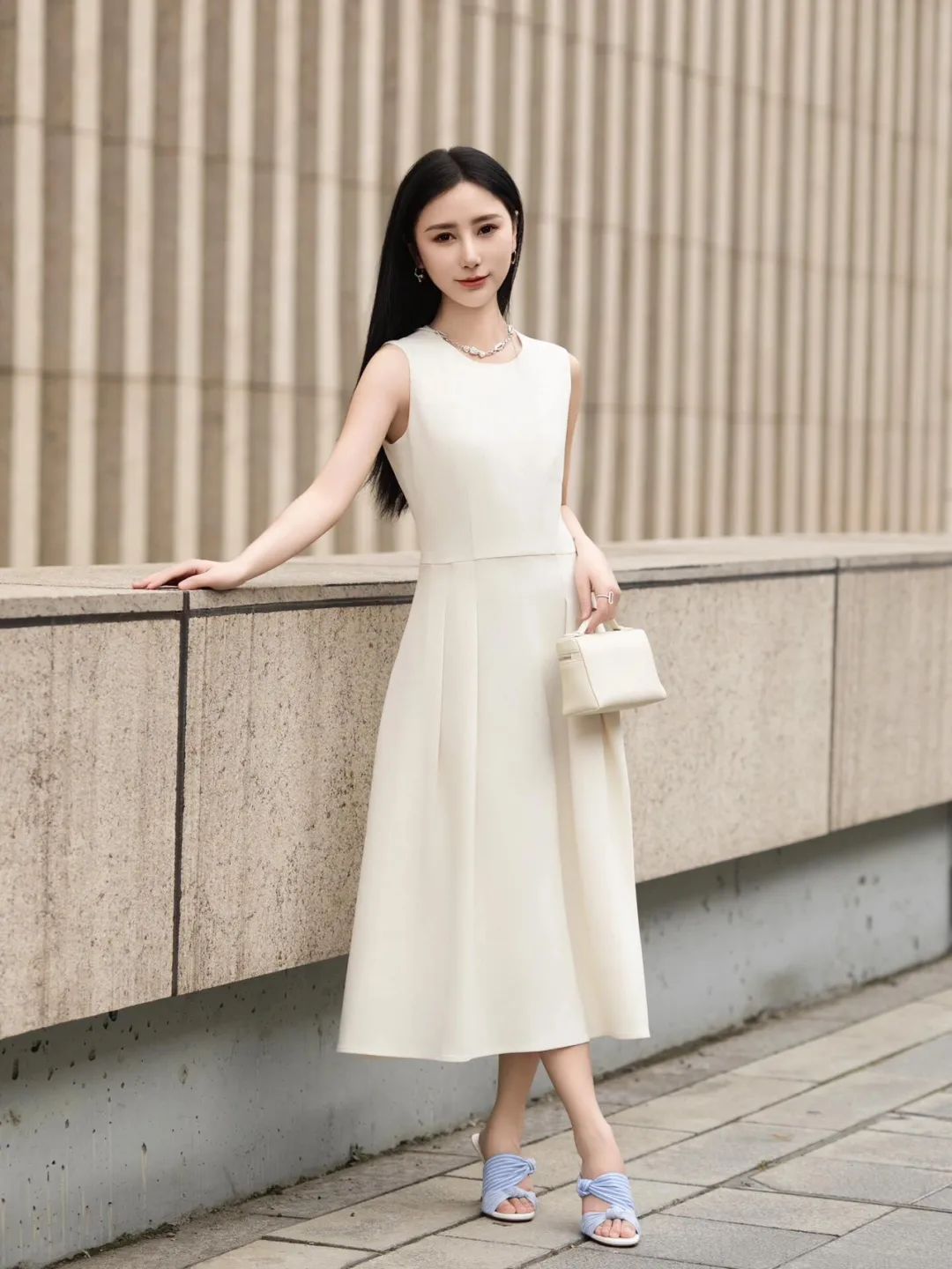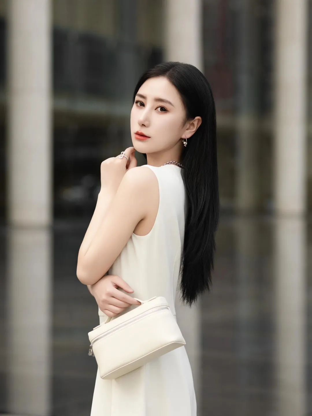4.站立姿态端庄,一手扶墙一手持包,双脚微微错落。这种姿势展现出自信与稳重。利用墙面延伸感,使人物更挺拔。光线从侧前方打过来,勾勒出轮廓,让白色连衣裙更具立体感,整体画面简洁大方。