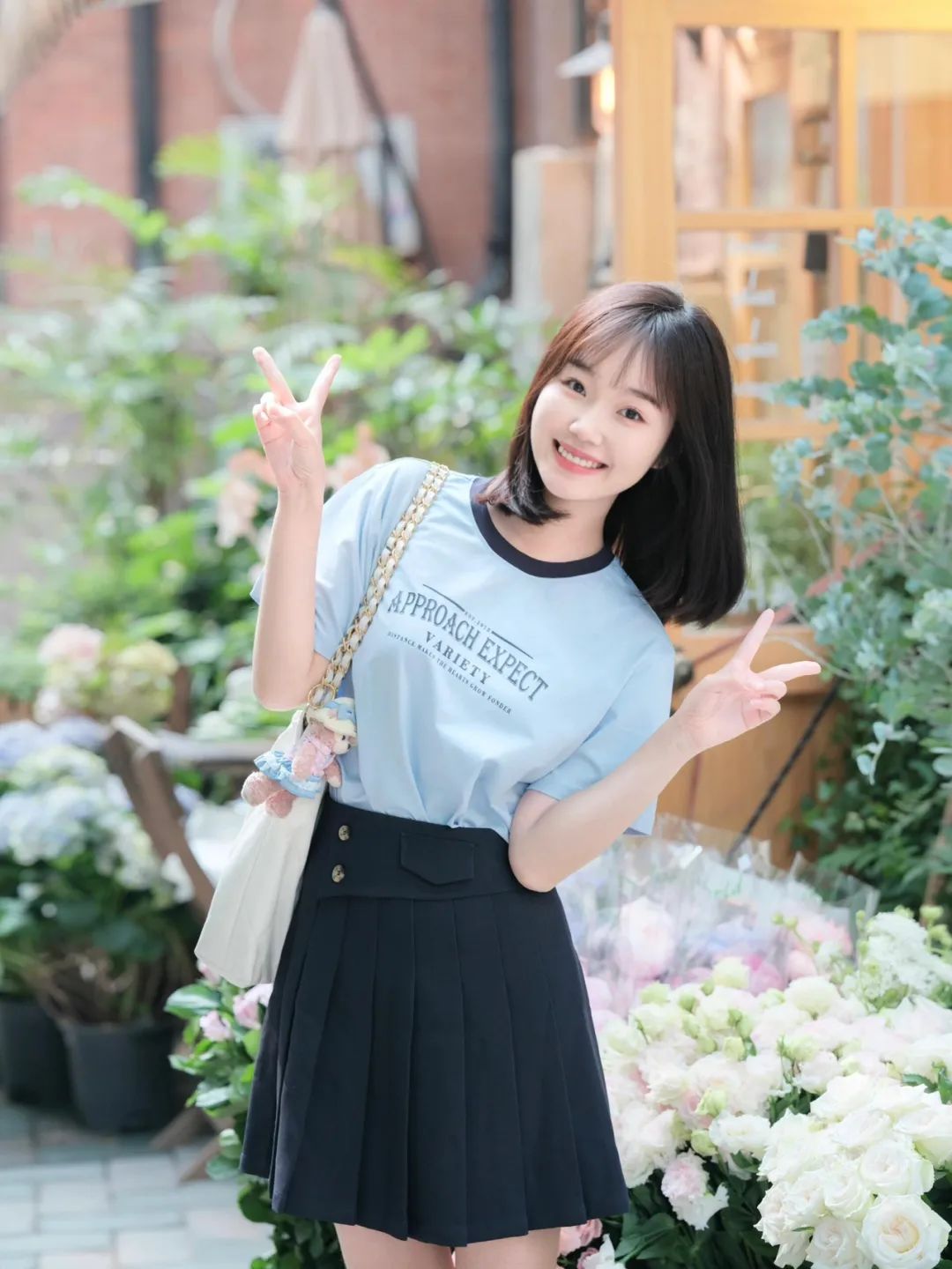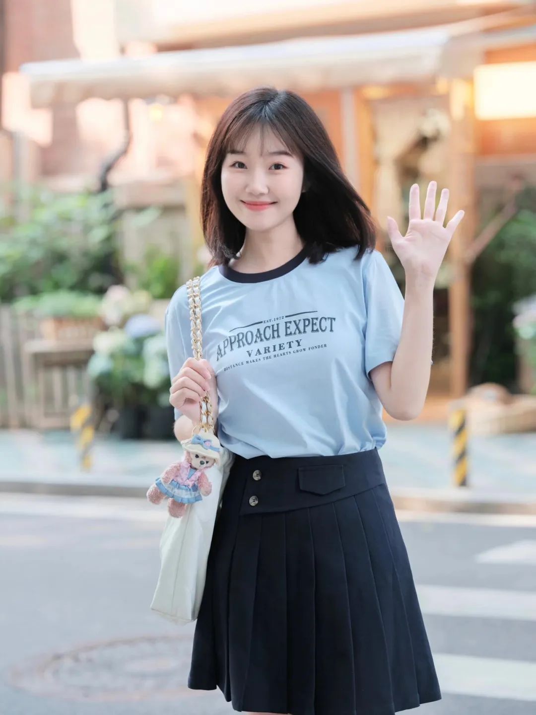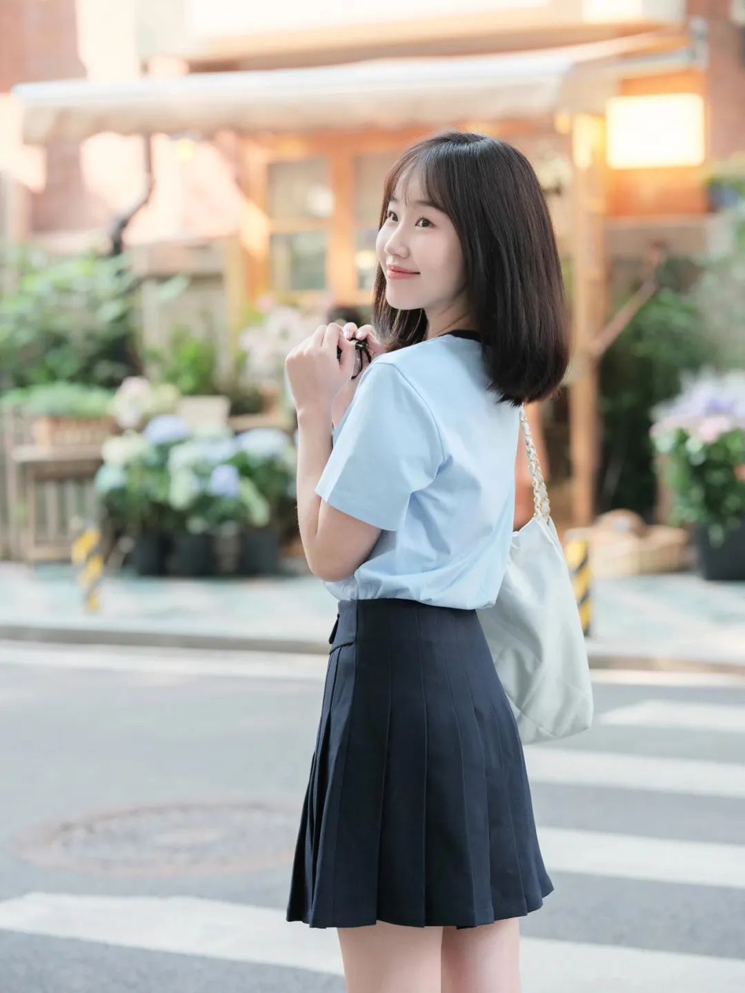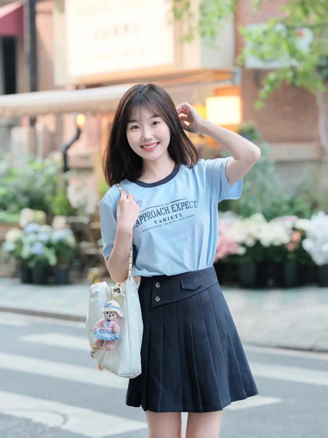 1.单手拿着眼镜,一手叉腰,姿态活泼。站在户外街道,背景虚化的绿植和建筑增添氛围感。利用自然光,突出浅蓝色T恤和黑色百褶裙的搭配,色彩清新。这种姿势展现出随性俏皮的感觉,仿佛在街头自在漫步,轻松定格青春活力瞬间。
