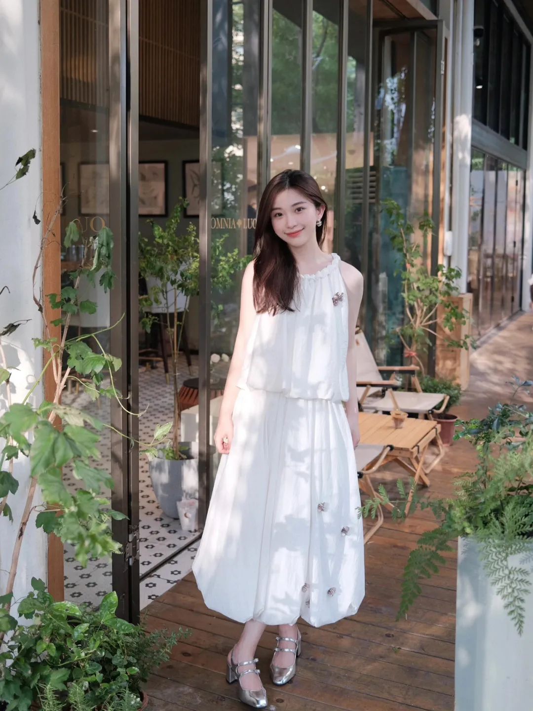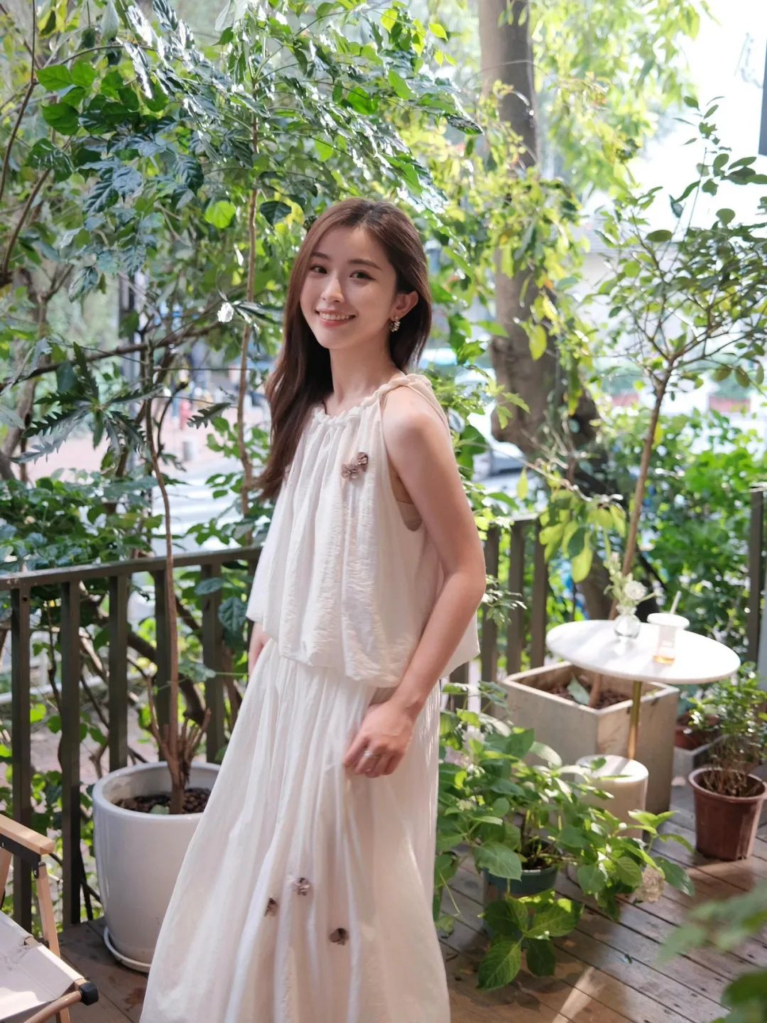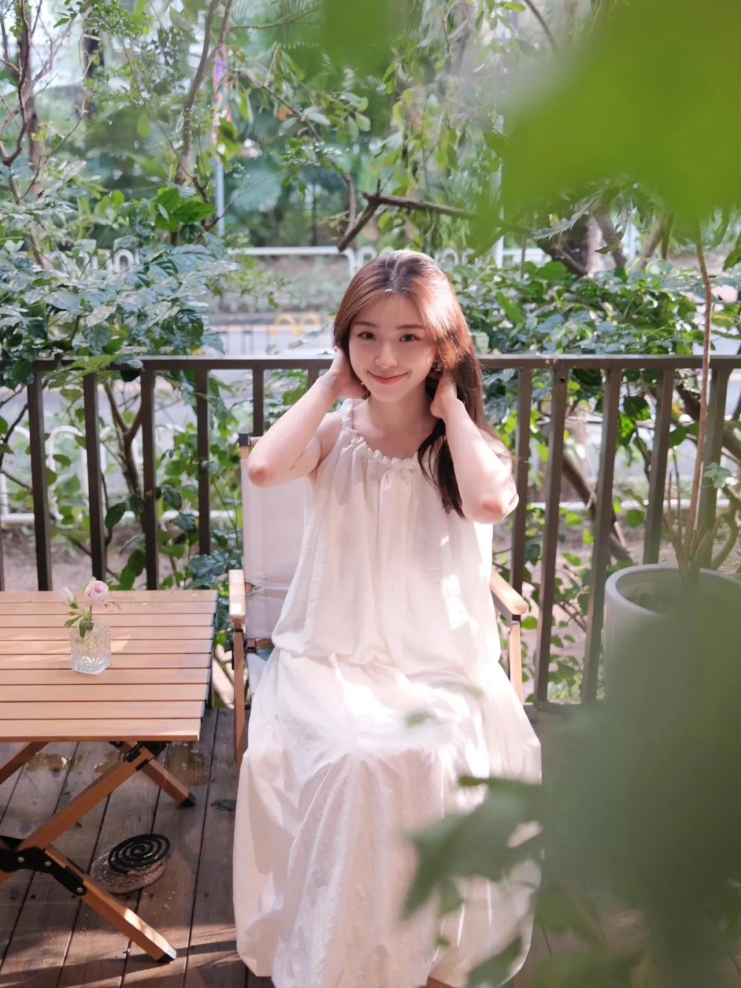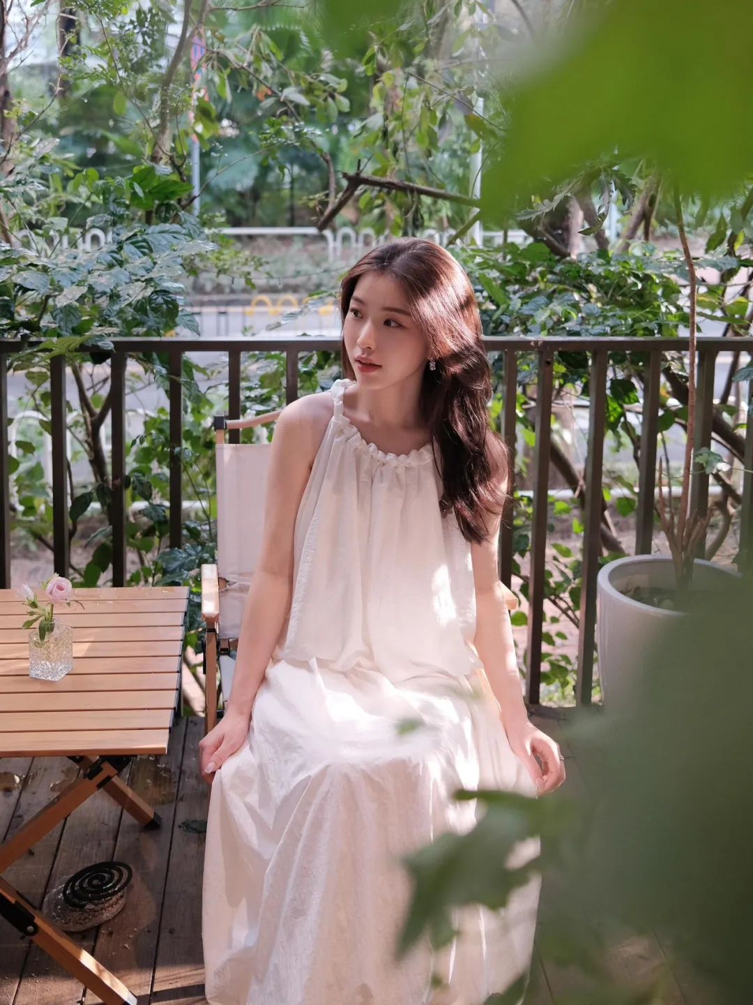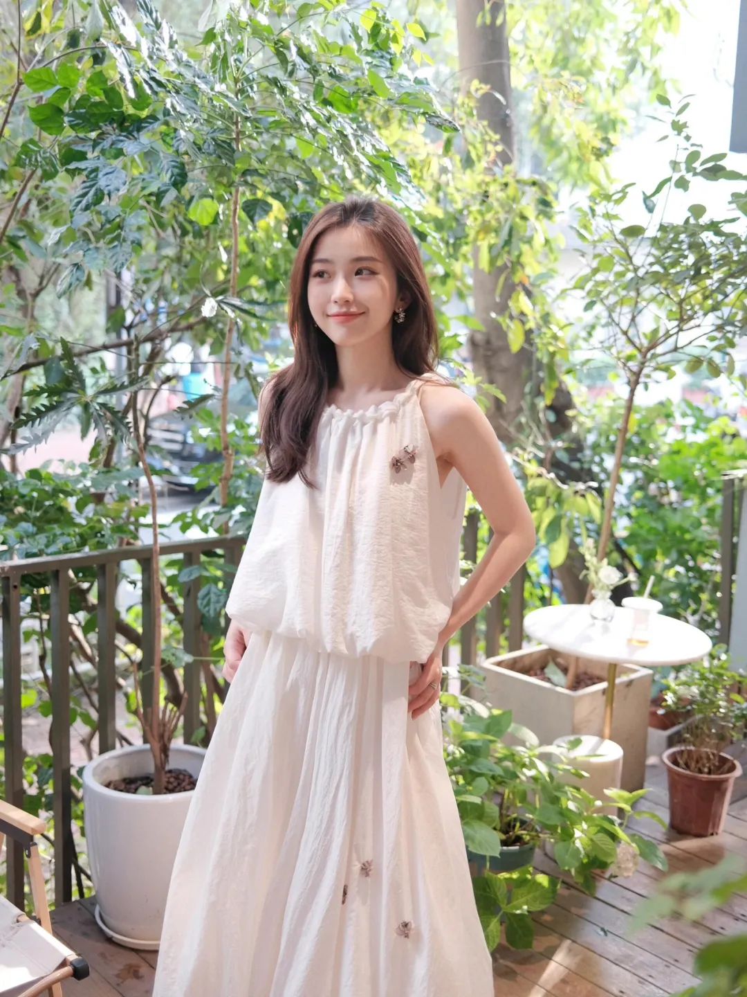 9.单手叉腰,身体微微扭转,姿态随性又自信。拍摄时巧妙运用侧逆光,勾勒出她曼妙的身形轮廓,整个人瞬间立体起来。背景郁郁葱葱的绿植和精致小桌,营造出自然惬意氛围。