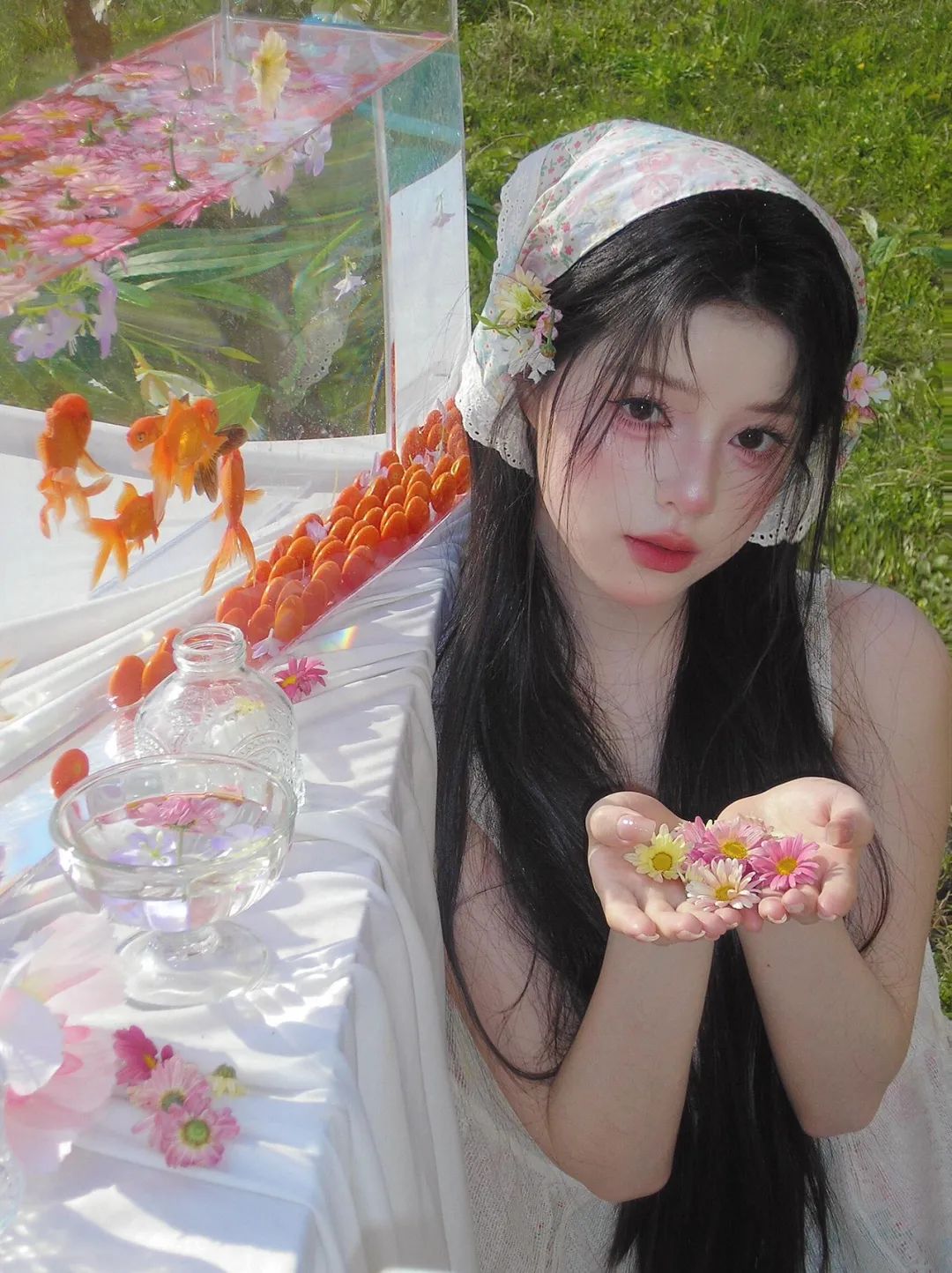 5.蹲在花丛中,双手捧着装有金鱼和花朵的玻璃缸,眼神专注又清澈。花丛作为前景和背景,增强画面的层次感和氛围感。蹲姿使人物与环境更好地融合,手中的玻璃缸成为视觉焦点,展现出人与自然和谐相处的美好画面。