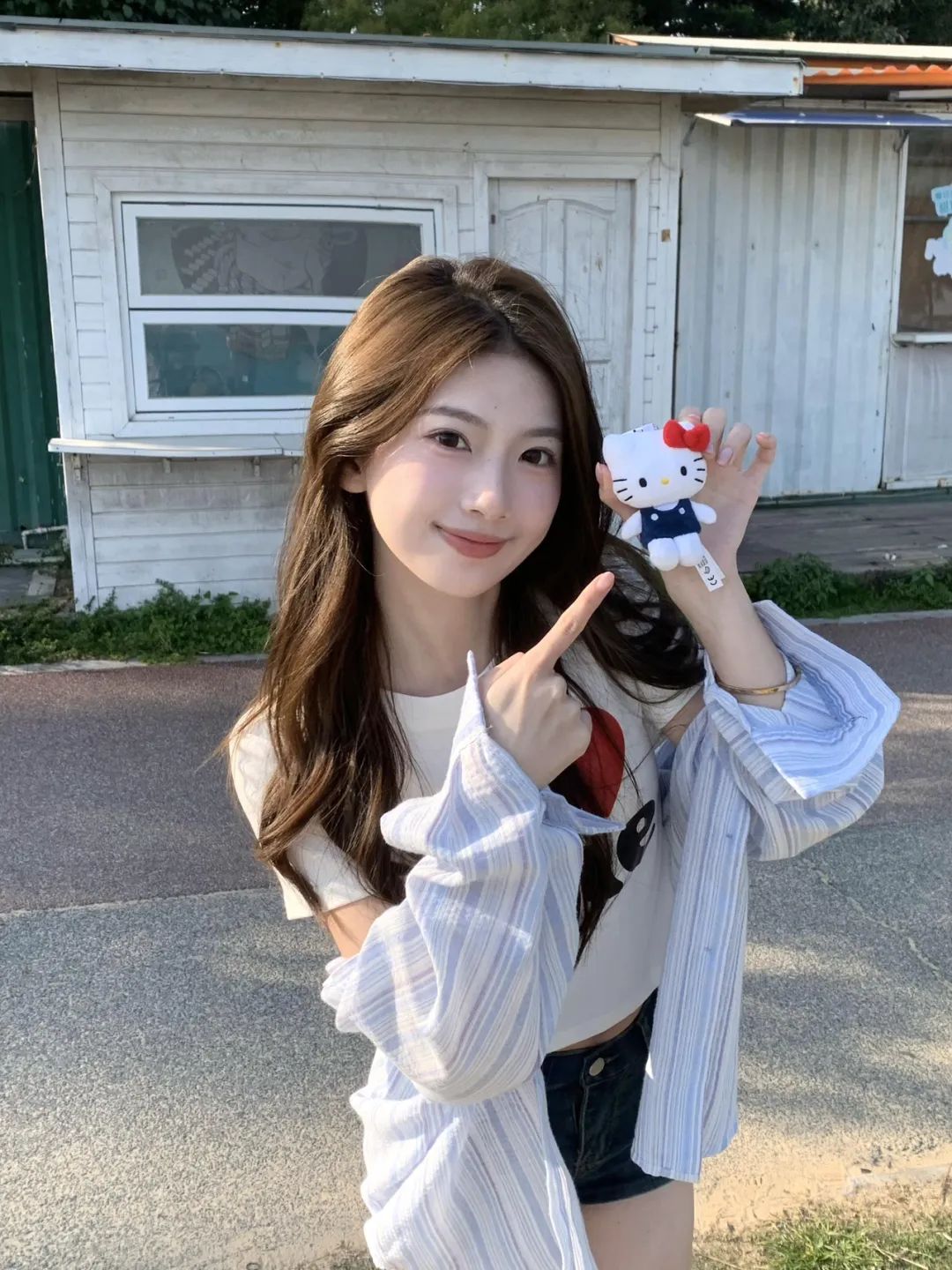 4.手拿可爱的Hello Kitty玩偶,用手指俏皮指向,眼神灵动。这个姿势瞬间拉近与观众的距离,充满少女感。背后的小屋和地面作为背景,画面和谐自然。阳光柔和地洒在身上,让肤色显得健康又有光泽,尽显青春甜美气息。