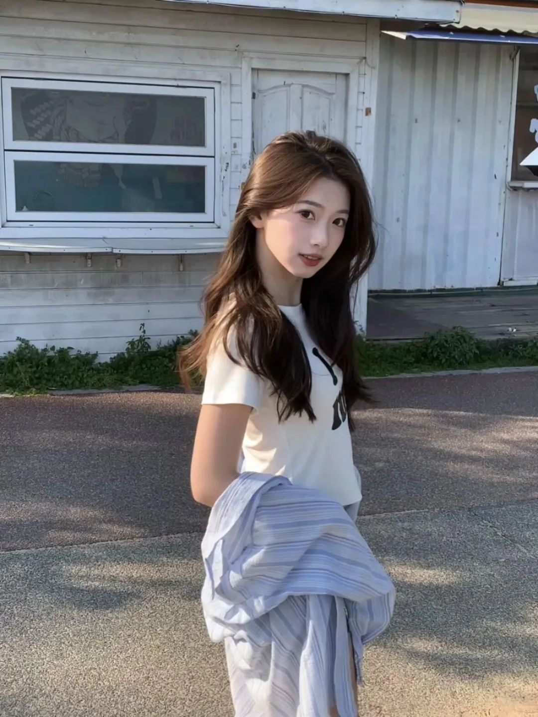 1.优雅地侧身站立,不经意地回眸看向镜头,发丝随风飘动,增添了几分随性自然。背后简洁的白色小屋,与她身上浅色穿搭相衬。拍摄者抓准时机,捕捉到自然光线洒在脸上的瞬间,让五官更立体,整个画面传递出一种清新又迷人的氛围感。
