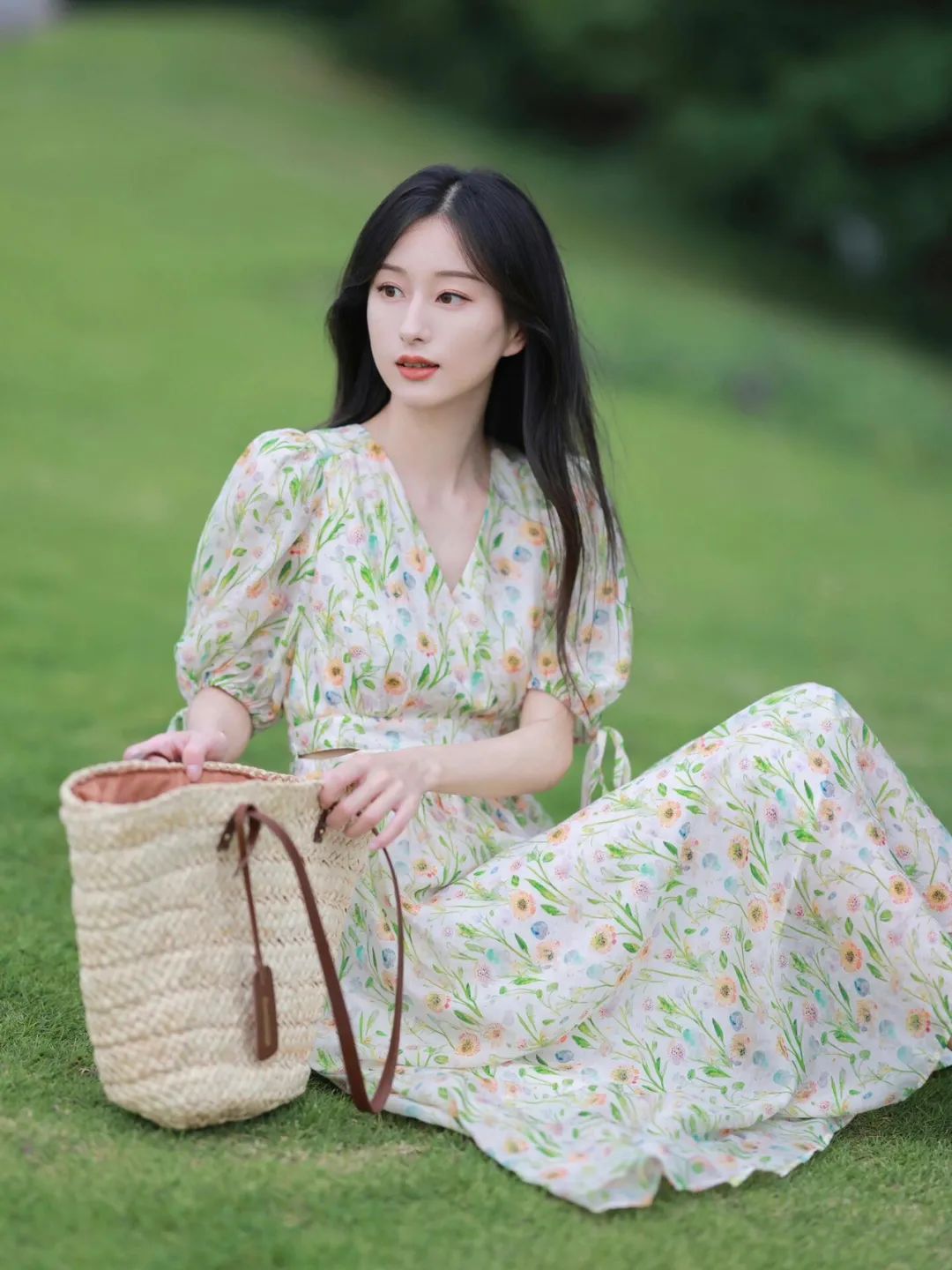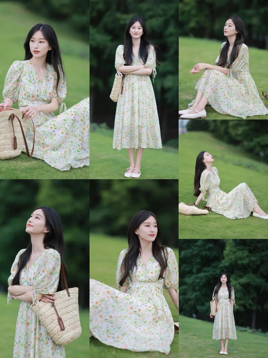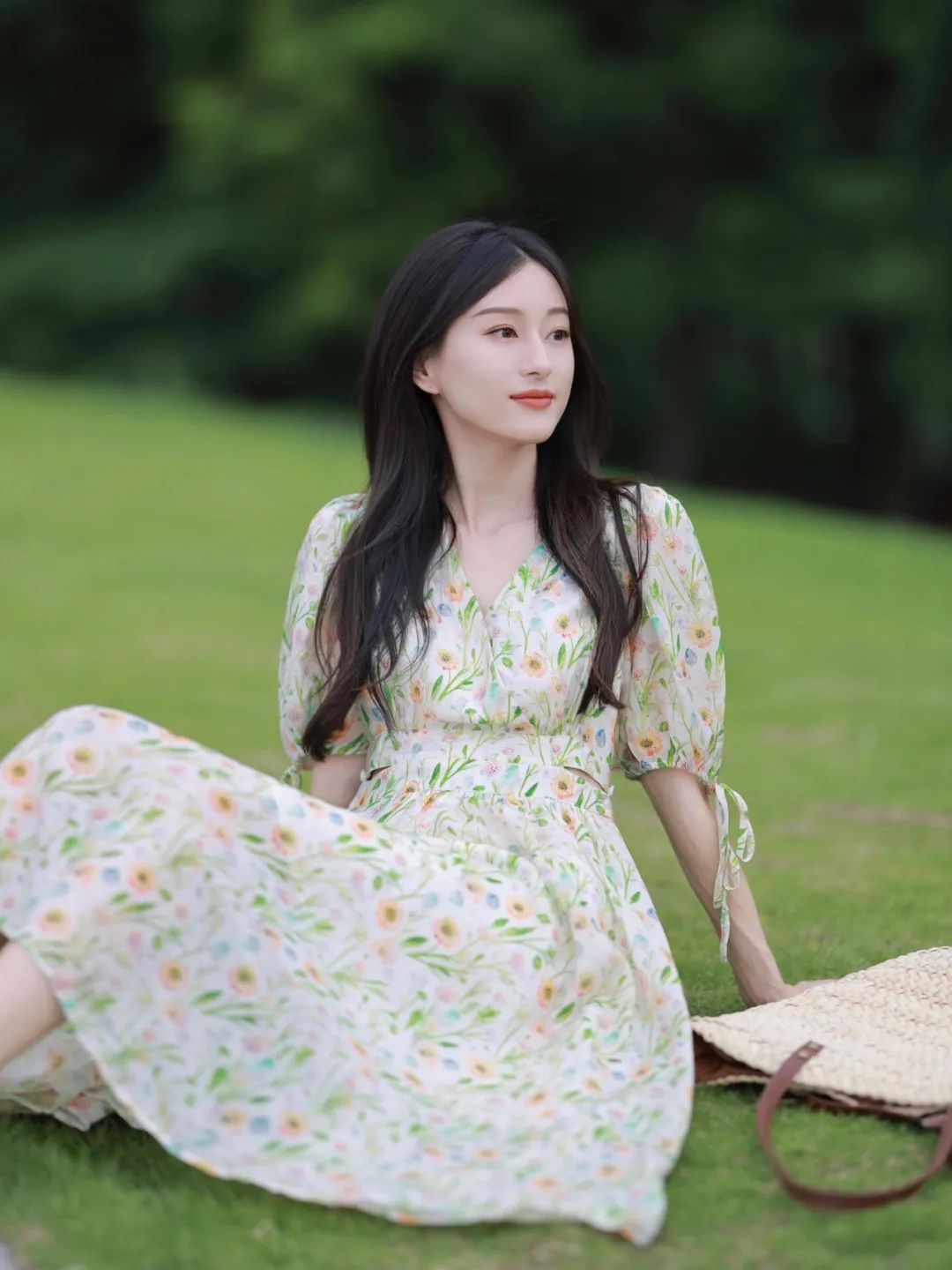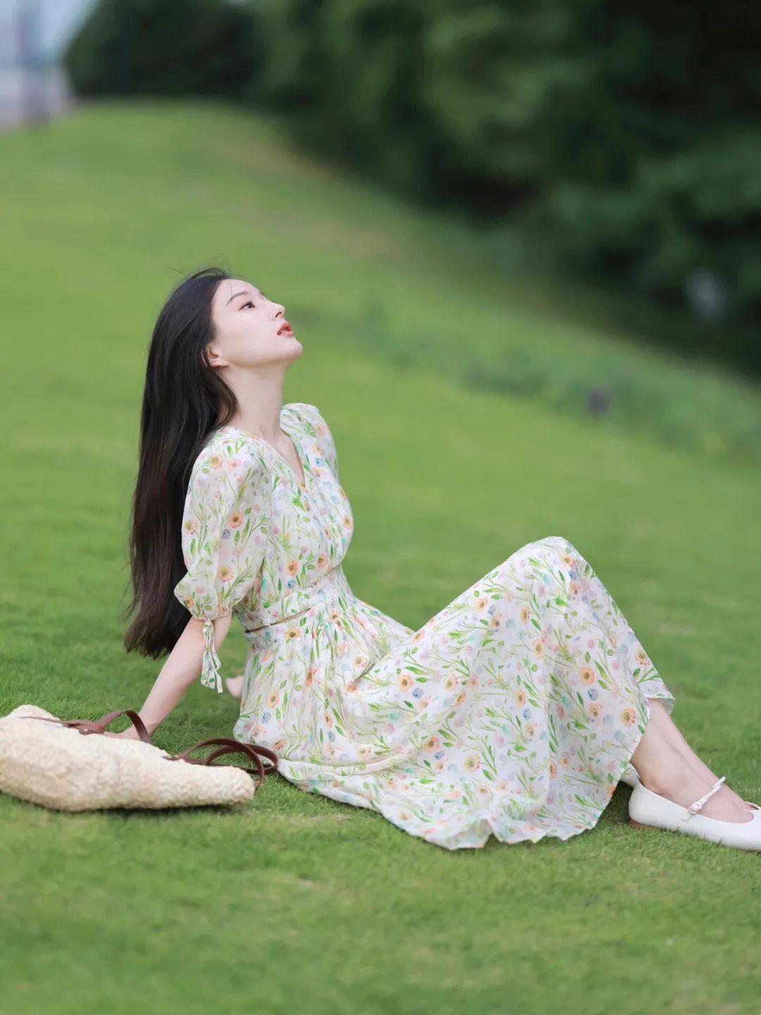 1.女生惬意地坐在草地上,一只手撑在身后,另一只手自然摆放,头微微向后仰,双眼望向天空,神态放松。背景选择大片绿色草地,利用自然景深将背景虚化,突出人物主体。人物的碎花裙与草地形成和谐的自然色调搭配,增强画面整体美感。