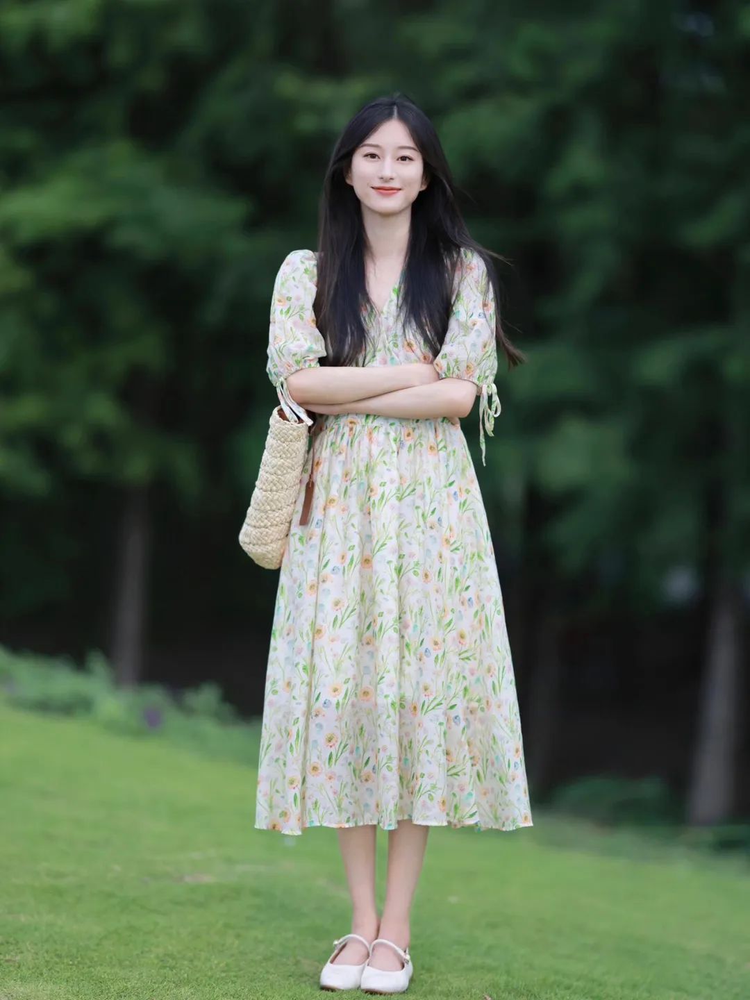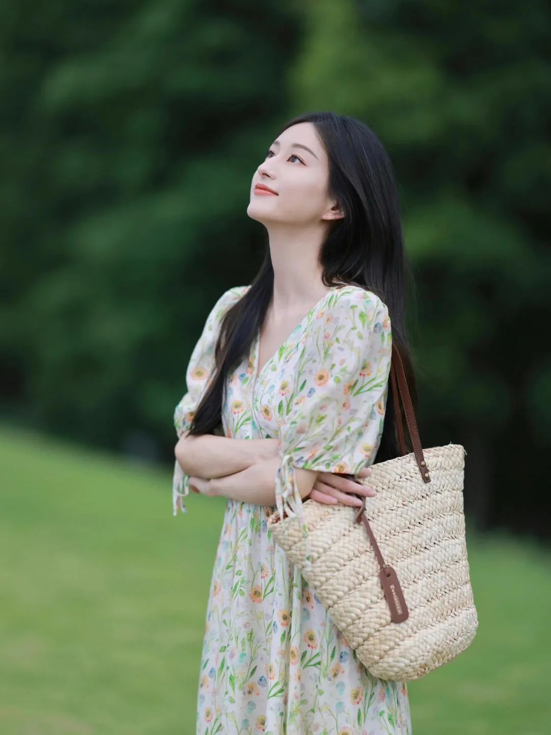 7.自然站立在草地上,一手轻提草编包,另一只手自然下垂,面带微笑,看向镜头方向。利用自然光拍摄,光线均匀,人物整体受光良好。背景的草地和树林形成自然的渐变,衬托出人物的清新气质。