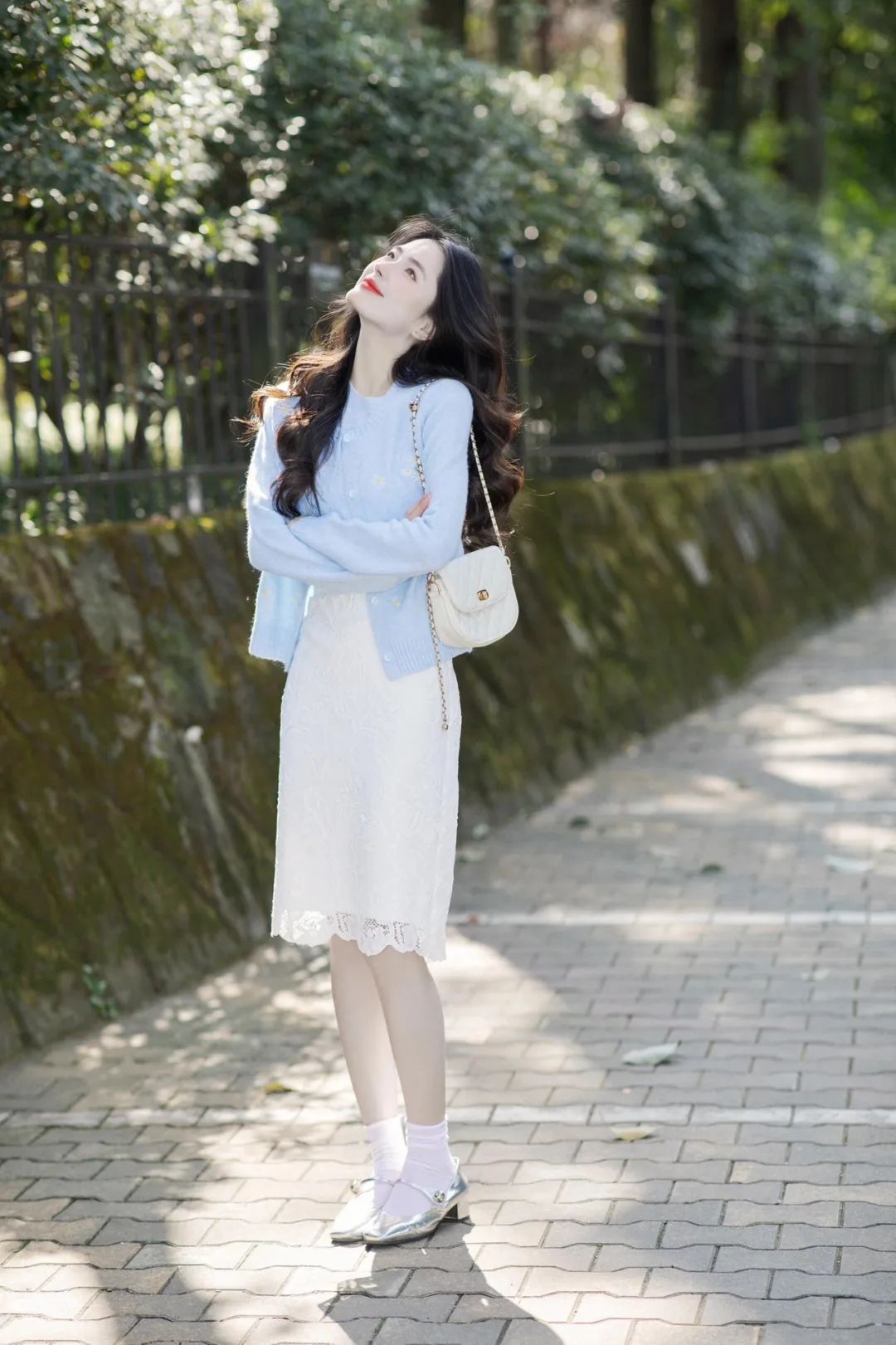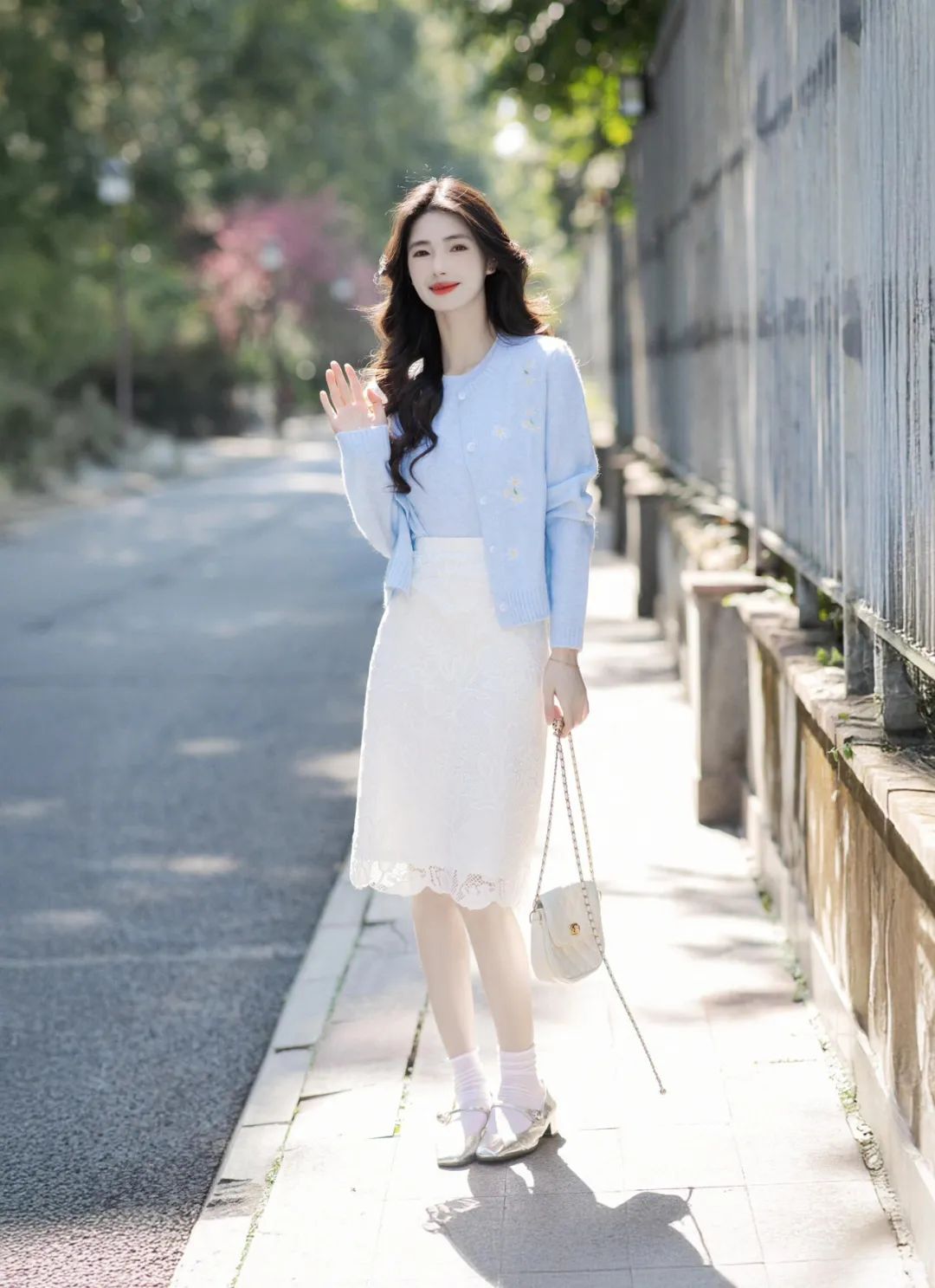 2.笔直地站在街道边,双手优雅交叠于身前,眼神自信又迷人。身后虚化的车辆和绿植,增添了画面的故事感。这种站姿简单大方,能很好地展现全身穿搭,尤其是白色蕾丝裙与浅蓝色针织衫的搭配,尽显优雅气质。
