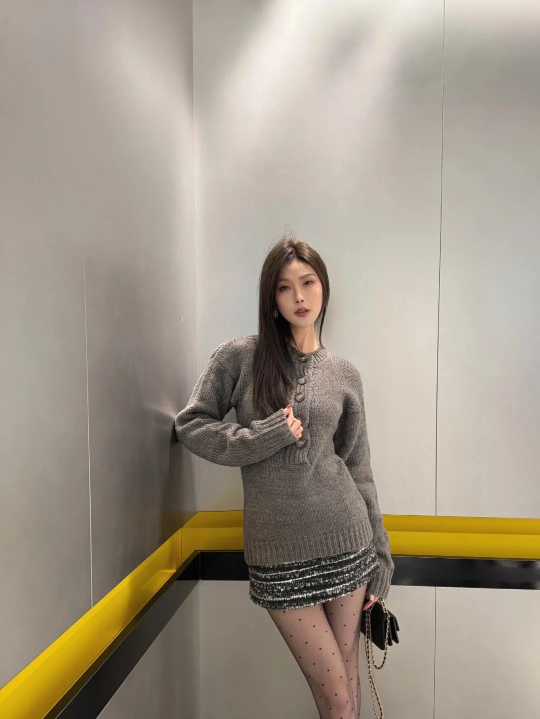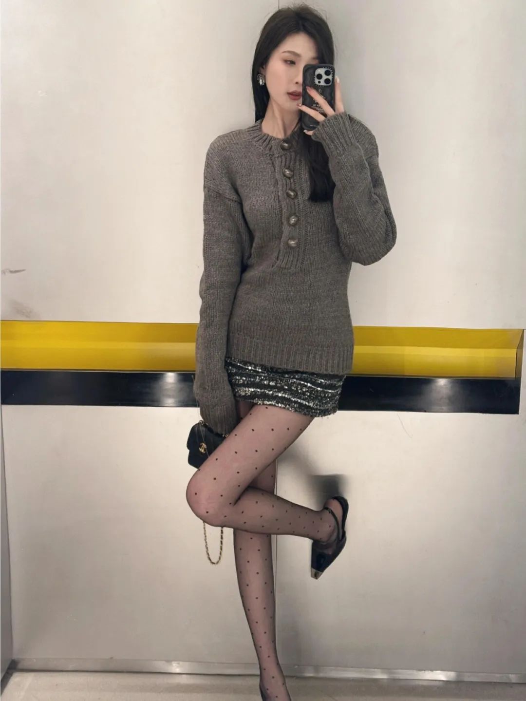 “灰毛衣+亮片裙搭配波点丝袜”, 慵懒又性感,这样穿好看炸了!