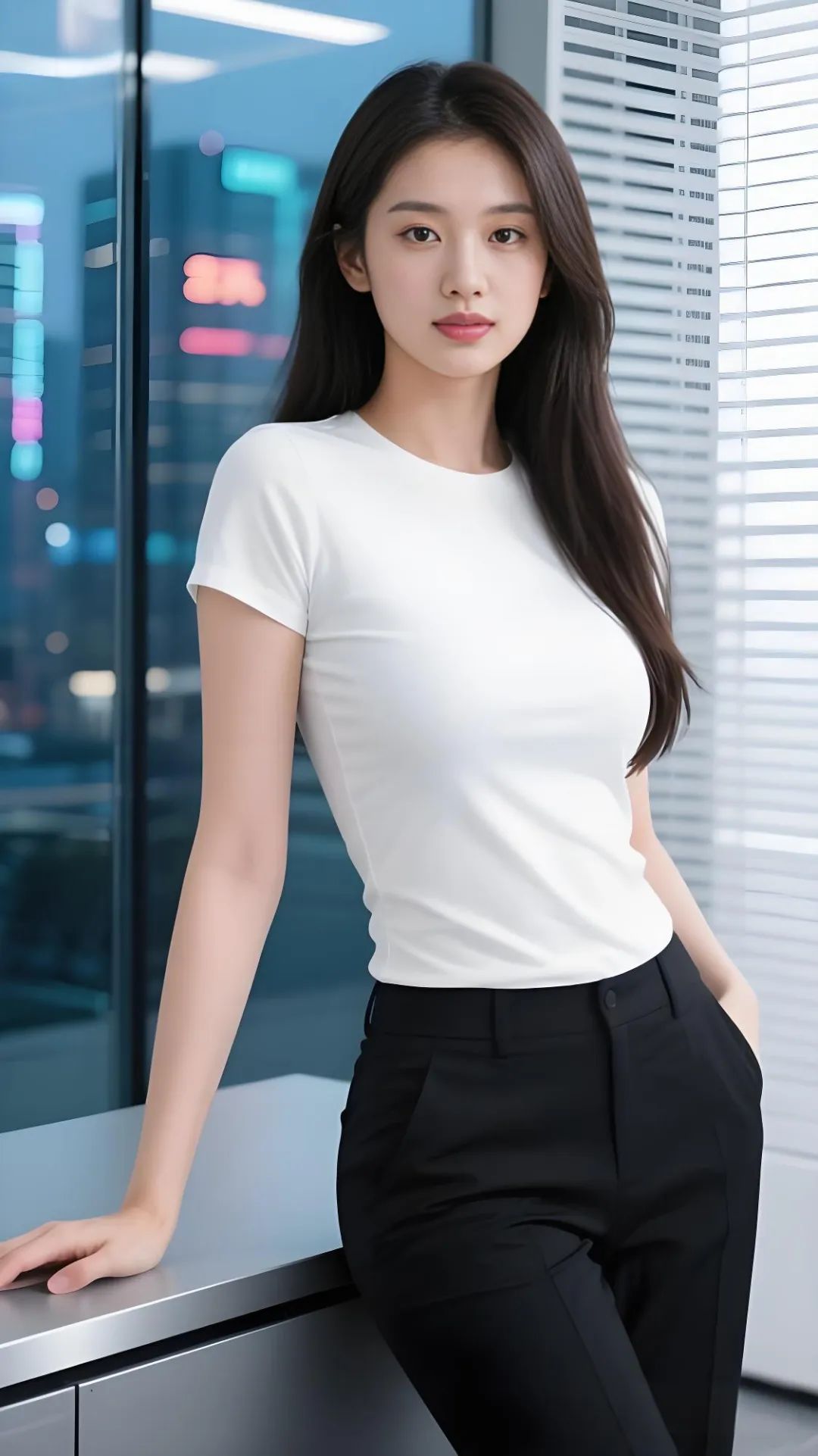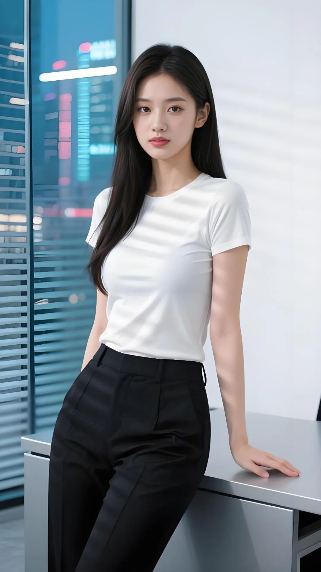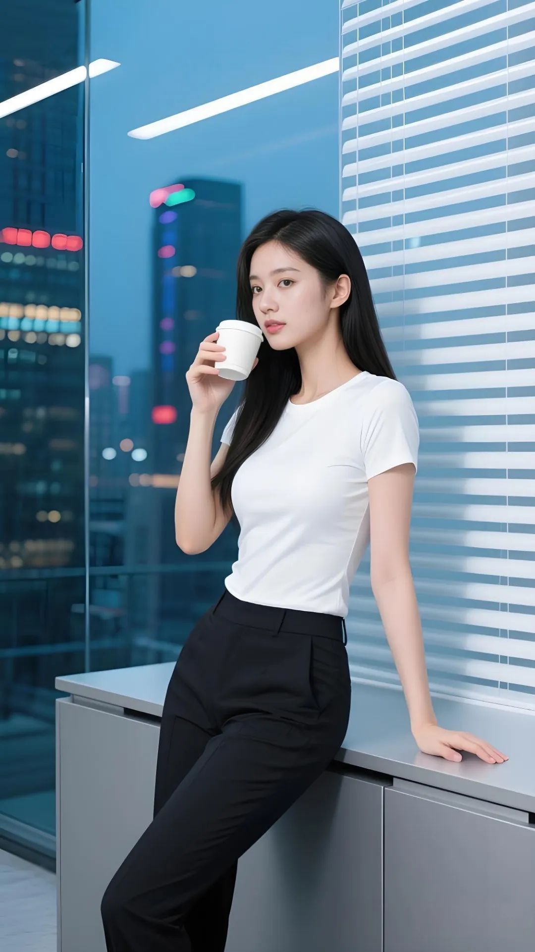 白T黑裤女白领在茶水间喝咖啡,美丽知性