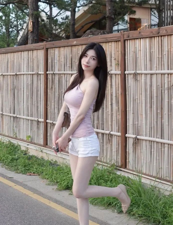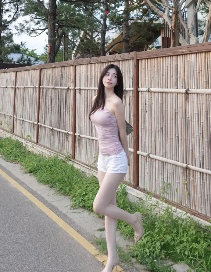 颜值穿搭:粉色单肩上衣+短裤+薄丝+米色高跟