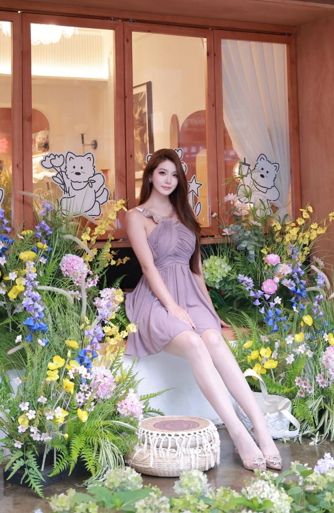 “紫色纱裙+光泽袜+凉高跟”,温婉知性,清新雅致的时尚魅力