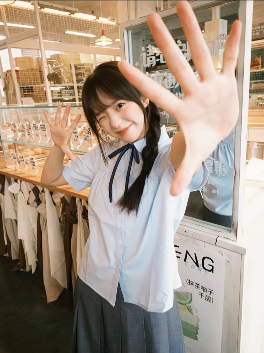 站姿,身体向一侧倾斜,双手比“勾勾”看向镜头微笑,这样拍出来的照片可爱灵动又趣味性十足,同时,身体向一侧倾斜画面更具动感。