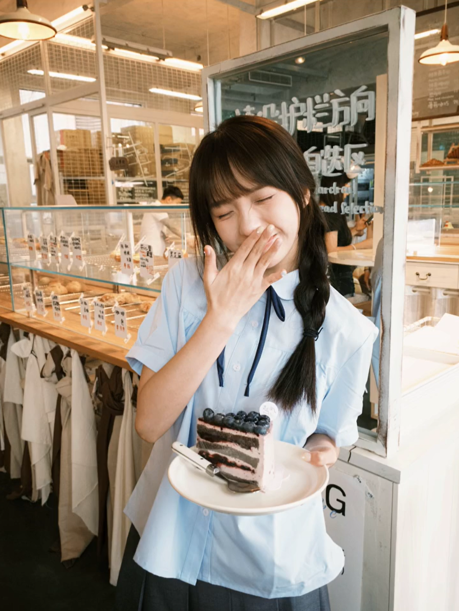 一手拿蛋糕,一手在脸旁比手势+wink。拍出来的照片超有活力感,既能让画面显得生动有趣,又能突出了美食,传递出开心俏皮的情绪,很适合逛街在这种温馨的小店环境里拍照。