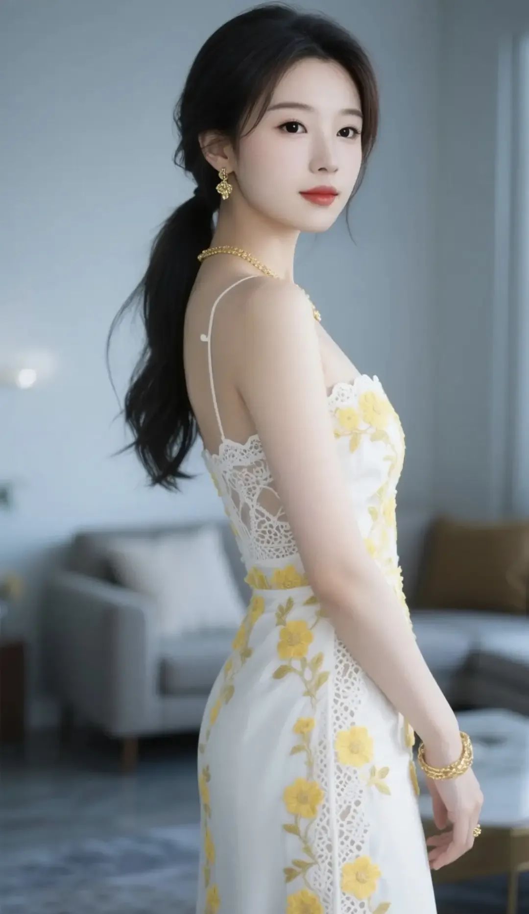 黄白蕾丝裙,金饰配佳人 艺帆风顺 发布于 2025-08-09 24 次阅读 女子身着黄白拼色连衣裙,裙身黄色部分印有白色花朵,白色部分为蕾丝材质。她佩戴金色项链和耳环,深色长发在脑后扎成马尾,背景是绿色墙壁的室内环境,墙边有白色沙发和带有金色边框的画作。